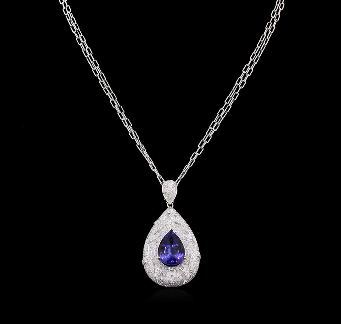 One electronically tested 14KT white gold ladies cast & assembled tanzanite and diamond pendant/enhancer with chain. The pendant/enhancer features a tanzanite set within an elaborate diamond lattice gallery with crescent and tear-drop accents, completed by a diamond bail with a snap-locking clasp. The pendant/enhancer is supported by an eighteen inch length 14KT white gold double strand chain with milgrain detailing, terminating in a lobster claw clasp. Bright polish finish with milgrain detailing. Trademark is Orianne. Identified with markings of "14K". Condition is new, good workmanship. Containing: Four Hundred bead and prong set round brilliant cut diamonds, measuring 1.50 - 1.10 x 0.78mm (depth est.) approximate total weight of 400 Stones = 3.20ct. Graded in the setting. Clarity: SI-1 to I-1. Color: G - I One prong set pear mixed cut natural tanzanite, measuring 17.00 x 12.20 x 6.70mm, 5%. bulge factor, approximate weight of 9.64ct., clarity is eye clean, type I, medium dark, very slightly grayish, violetish blue color, (GIA vB 6/3), cut is good. Transmitting light with no distortion, transparent. Graded in the setting. Tanzanite is a very rare gemstone that is only found in the country of Tanzania. Originally discovered in 1967. Tiffany & Company, named the stone Tanzanite. It is found in the Usumburu Mountains that border the Umba Valley of northern Tanzania. Tanzanite occurs in gray, brown, violet, blue, reddish-purple, & green. The gem is interesting because of its exceptional pleochroism. Rotated in different directions a tanzanite will exhibit multiple changes of color. Tanzanite has a low tolerance to ultrasonic cleaning, and should not be cleaned using this method. Total Weight of Colored Stones 9.64ct. Total Weight of Diamonds 3.20ct. AIG Appraised at $40,285.00.