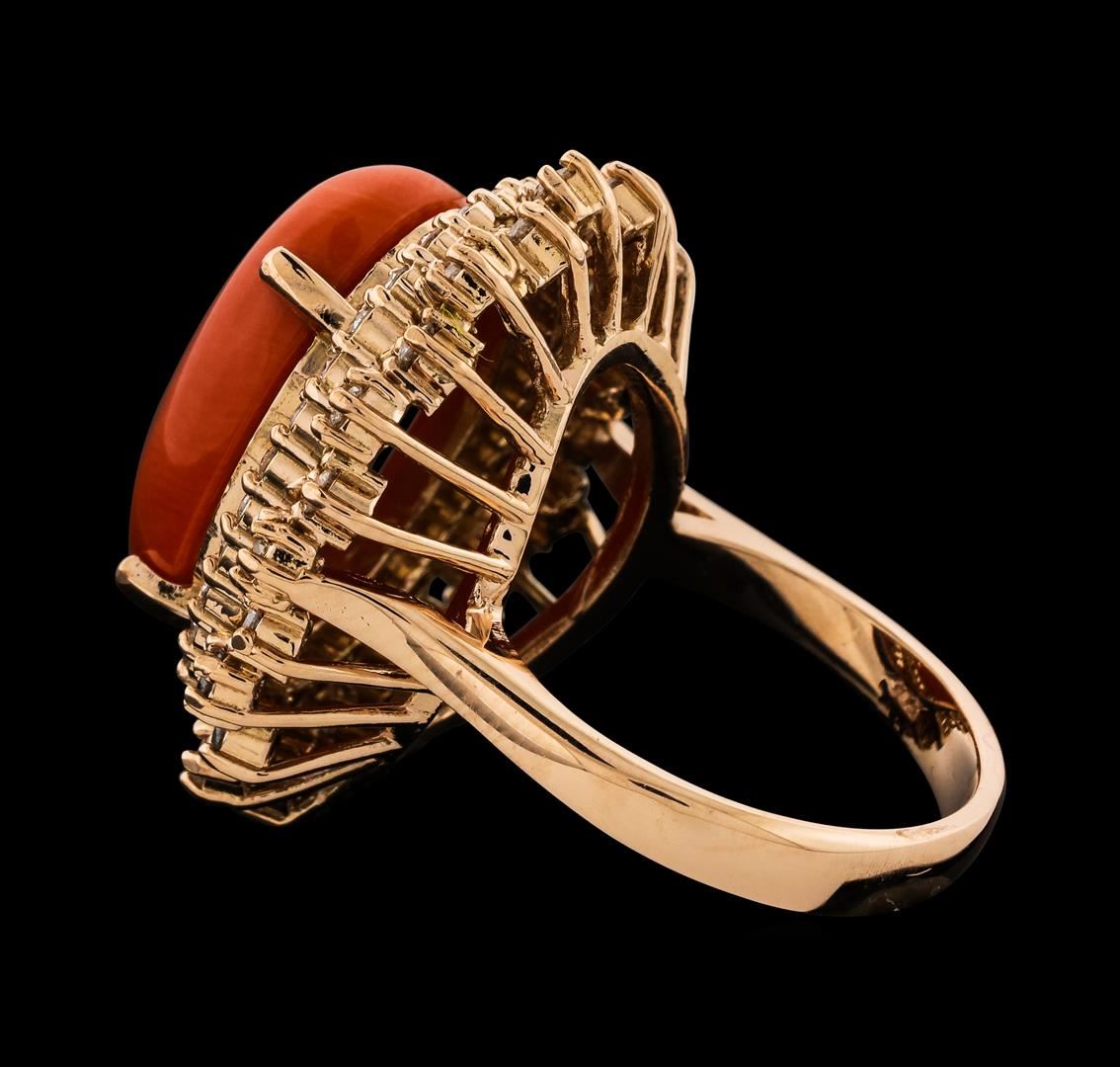 One electronically tested 14KT rose gold lady's cast fashion ring with a double basket halo with a bright polish finish. The featured lady's ring has a shank measuring 3.24 millimeters wide. Identified with markings of 'K14'. Condition is new, good workmanship. Containing: One prong set oval cabochon standard cut natural red coral, measuring 18.22 x 13.27 x 4.91mm, (depth est.) 15%. bulge factor, approximate weight of 9.68ct., clarity is eye clean, medium, slightly brownish, reddish orange color, (GIA rO 5/2), cut is very good. Colored gemstones are presumed to have been subjected to commonly used enhancement processes. Graded in the setting. Twelve prong set round brilliant cut diamonds, measuring 2.10 - 2.05 x 1.29mm (depth est.) approximate total weight of 12 Stones = 0.40ct. Graded in the setting. Clarity SI-1 to I-1. Color: H - I Cut Good Twelve prong set round brilliant cut diamonds, measuring 1.80 - 1.75 x 1.10mm (depth est.) approximate total weight of 12 Stones = 0.26ct. Graded in the setting. Clarity SI-1 to SI-2. Color: H - I Cut Good Thirty-Two prong set round brilliant cut diamonds, measuring 1.60 - 1.50 x 0.96mm (depth est.) approximate total weight of 32 Stones = 0.46ct. Graded in the setting. Clarity SI-1 to SI-3. Color: H - I Cut Good. Total Weight of Colored Stones 9.68ct.. Total Weight of Diamonds 1.12ct.. Total Weight of Ring 11.00gm. GAS Appraised at $9,400.00.
