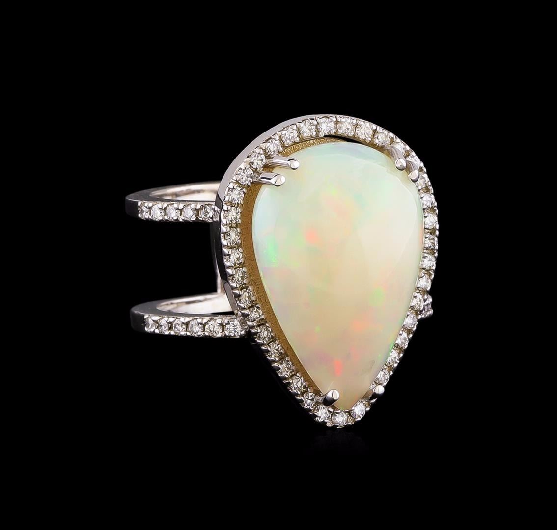 One electronically tested 14KT white gold ladies cast opal and diamond ring with a bright polish finish. The featured Welo Ethiopian opal is set within a diamond bezel supported by diamond set double shoulders each measuring one millimeter wide. The shoulders are connected to create a nine millimeter wide open band. Condition is new, good workmanship. Containing: One semi crystal opal that is cut in a pear shaped cabochon and is prong set, measuring 19.00 mm long x 13.20 mm wide, and 6.20 mm thick and the approximate weight is 9.70 carats. The opal has a somewhat bright, multicolor play of color (fire) in a flashfire pattern; a medium dome; a good cut; no inclusions; slight variation in base in its brightness and pattern; and is slightly directional. Graded in the setting. Sixty prong set round brilliant cut diamonds, measuring 1.30 - 1.20 x 0.75mm (depth est.) approximate total weight of 60 Stones = 0.52ct. Graded in the setting. Clarity: SI-1 to I-1. Color: F - H. Total Weight of Diamonds 0.52ct. Total Weight of Opals 9.70ct. Total Weight of Ring 7.94gm. AIG Appraised at $5,735.00.