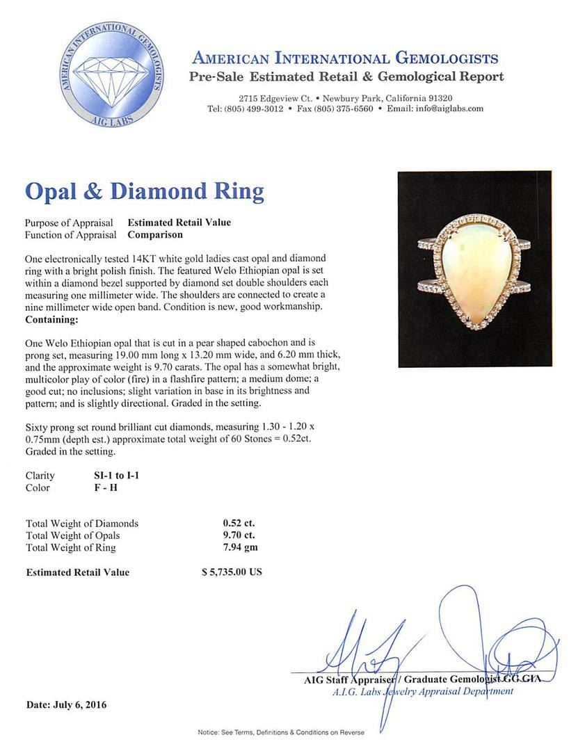 One electronically tested 14KT white gold ladies cast opal and diamond ring with a bright polish finish. The featured Welo Ethiopian opal is set within a diamond bezel supported by diamond set double shoulders each measuring one millimeter wide. The shoulders are connected to create a nine millimeter wide open band. Condition is new, good workmanship. Containing: One semi crystal opal that is cut in a pear shaped cabochon and is prong set, measuring 19.00 mm long x 13.20 mm wide, and 6.20 mm thick and the approximate weight is 9.70 carats. The opal has a somewhat bright, multicolor play of color (fire) in a flashfire pattern; a medium dome; a good cut; no inclusions; slight variation in base in its brightness and pattern; and is slightly directional. Graded in the setting. Sixty prong set round brilliant cut diamonds, measuring 1.30 - 1.20 x 0.75mm (depth est.) approximate total weight of 60 Stones = 0.52ct. Graded in the setting. Clarity: SI-1 to I-1. Color: F - H. Total Weight of Diamonds 0.52ct. Total Weight of Opals 9.70 ct. Total Weight of Ring 7.94gm. AIG Appraised.