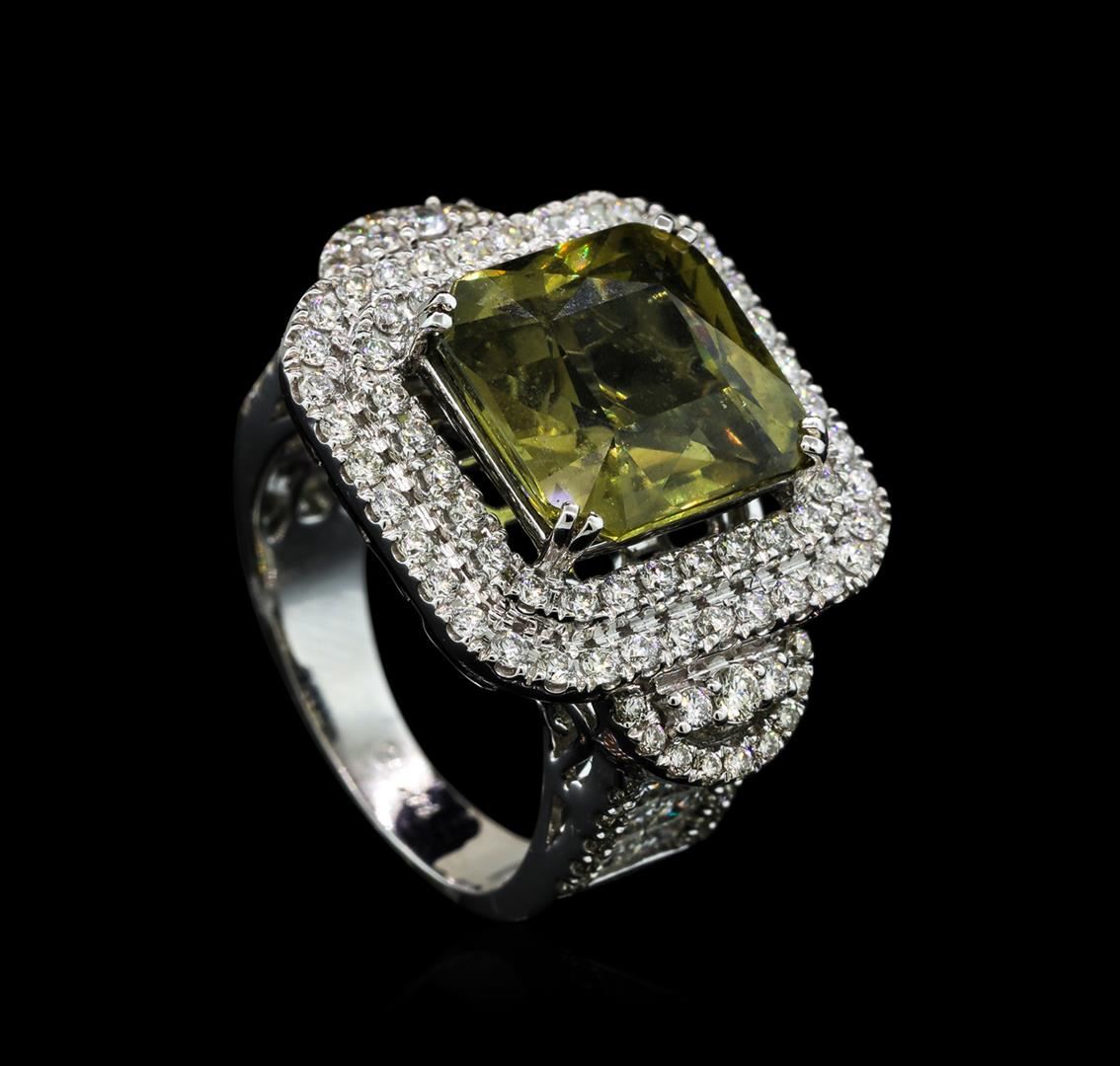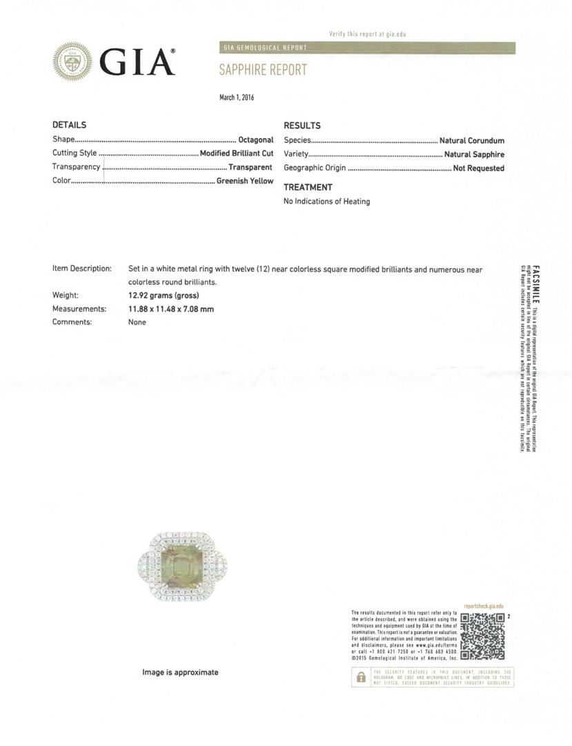 One electronically tested 14KT white gold lady's cast fashion ring with a double cushion halo with a bright polish finish. The featured lady's ring has a shank measuring 3.55 millimeters wide. Identified with markings of '14K'. Condition is new, good workmanship. Containing: One prong set emerald modified brilliant cut natural yellow sapphire-unenhanced, measuring 11.88 x 11.48 x 7.08mm, (depth est.) approximate weight of 9.71ct., clarity is slightly included, medium, very slightly brownish, greenish yellow color, (GIA gY 5/3), cut is very good. Transmitting light with a minimum of distortion, transparent. No indications of heat treatment. Graded in the setting in the GIA Laboratory, Report #2173500739. Twelve invisible set princess cut diamonds, measuring 2.30 x 2.20 x 1.65mm (depth est.) approximate total weight of 12 Stones = 0.82ct. Graded in the setting. Clarity VS-1 to VS-2. Color: H - I Cut Very Good Two prong set round brilliant cut diamonds, measuring 2.20 - 2.15 x 1.35mm (depth est.) approximate total weight of 2 Stones = 0.08ct. Graded in the setting. Clarity SI-1. Color: I Cut Good One Hundred Eight prong set round brilliant cut diamonds, measuring 1.40 - 1.20 x 0.81mm (depth est.) approximate total weight of 108 Stones = 0.94ct. Graded in the setting. Clarity VS-2 to SI-1. Color: G - H Cut Good. Total Weight of Colored Stones 9.71ct.. Total Weight of Diamonds 1.84ct.. Total Weight of Ring 13.10gm GAS Appraised at $34,795.00.