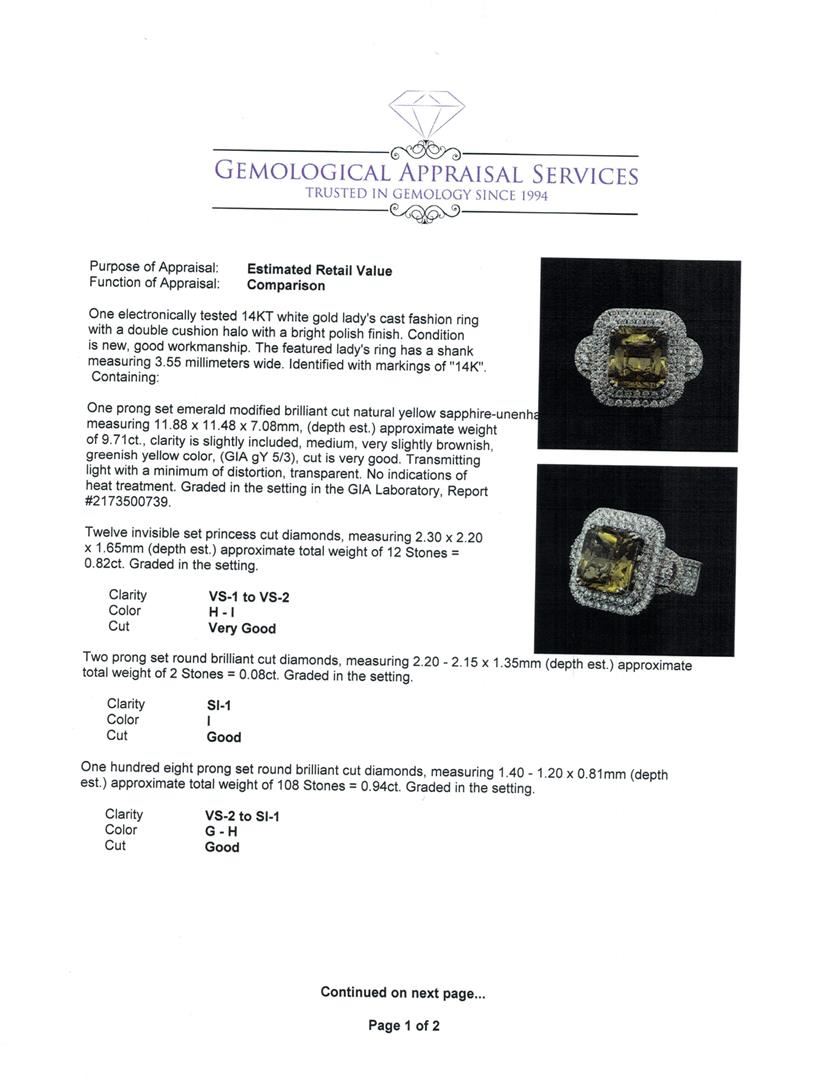 One electronically tested 14KT white gold lady's cast fashion ring with a double cushion halo with a bright polish finish. The featured lady's ring has a shank measuring 3.55 millimeters wide. Identified with markings of '14K'. Condition is new, good workmanship. Containing: One prong set emerald modified brilliant cut natural yellow sapphire-unenhanced, measuring 11.88 x 11.48 x 7.08mm, (depth est.) approximate weight of 9.71ct., clarity is slightly included, medium, very slightly brownish, greenish yellow color, (GIA gY 5/3), cut is very good. Transmitting light with a minimum of distortion, transparent. No indications of heat treatment. Graded in the setting in the GIA Laboratory, Report #2173500739. Twelve invisible set princess cut diamonds, measuring 2.30 x 2.20 x 1.65mm (depth est.) approximate total weight of 12 Stones = 0.82ct. Graded in the setting. Clarity VS-1 to VS-2. Color: H - I Cut Very Good Two prong set round brilliant cut diamonds, measuring 2.20 - 2.15 x 1.35mm (depth est.) approximate total weight of 2 Stones = 0.08ct. Graded in the setting. Clarity SI-1. Color: I Cut Good One Hundred Eight prong set round brilliant cut diamonds, measuring 1.40 - 1.20 x 0.81mm (depth est.) approximate total weight of 108 Stones = 0.94ct. Graded in the setting. Clarity VS-2 to SI-1. Color: G - H Cut Good. Total Weight of Colored Stones 9.71ct.. Total Weight of Diamonds 1.84ct.. Total Weight of Ring 13.10gm GAS Appraised at $34,795.00.