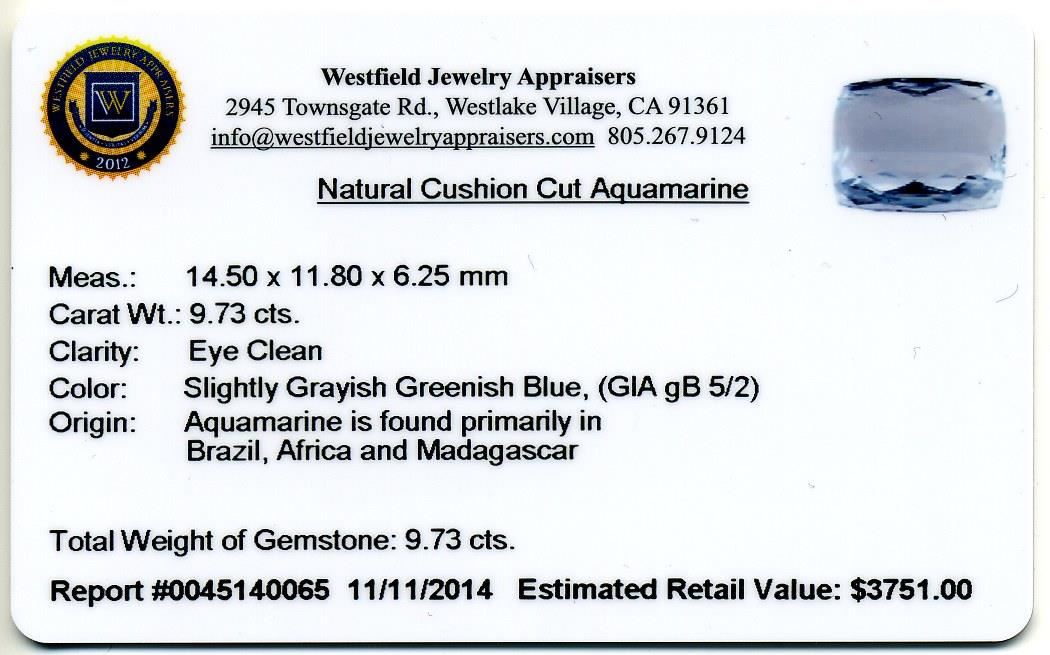 9.73ct Cushion Cut Natural Cushion Cut Aquamarine. Westfield Appraised at $3,751.00.