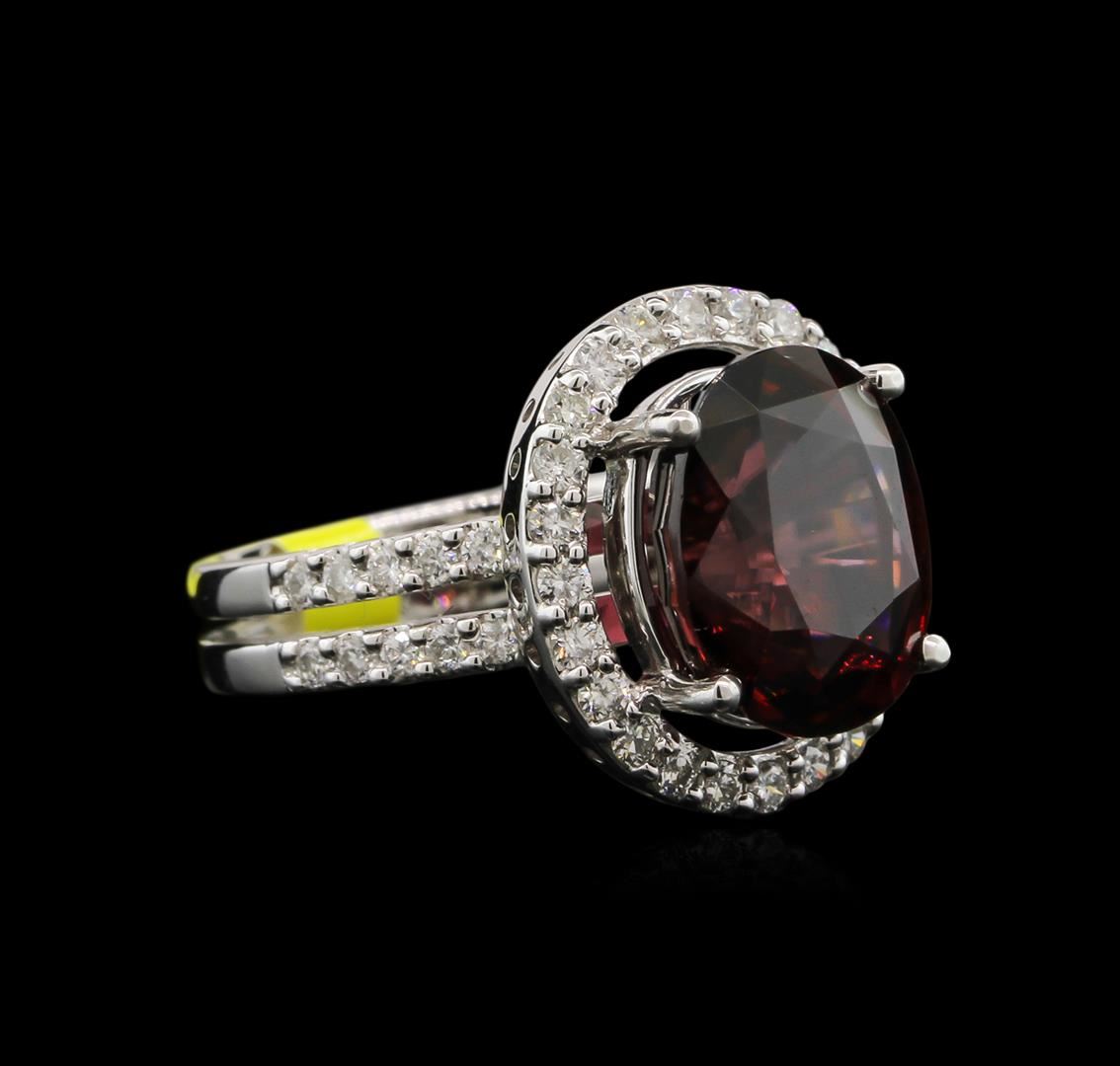 One electronically tested 14KT white gold lady's cast fashion ring with a split shank with a bright polish finish. The featured lady's ring has an oval halo motif with a 4.0 millimeter wide shank. Identified with markings of "14K". Condition is new, good workmanship. Containing: One prong set oval standard brilliant cut natural red zircon, measuring 12.30 x 9.80 x 7.80mm, approximate weight of 9.75ct., clarity is eye clean, type II, medium, very slightly brownish, orangy red color, (GIA oR 5/3), cut is very good. Colored gemstones are presumed to have been subjected to commonly used enhancement processes, Graded in the setting. Forty-Four shared prong set round brilliant cut diamonds, measuring 1.75 - 1.65 x 1.10mm (depth est.) approximate. Total Weight of 44 Stones = 0.92ct. Graded in the setting. Clarity: SI-2 to I-1. Color: H - I. Cut Good. Total Weight of Colored Stones 9.75ct. Total Weight of Diamonds 0.92ct. Total Weight of Ring 8.20gm. GAS Appraised at $10,315.00.