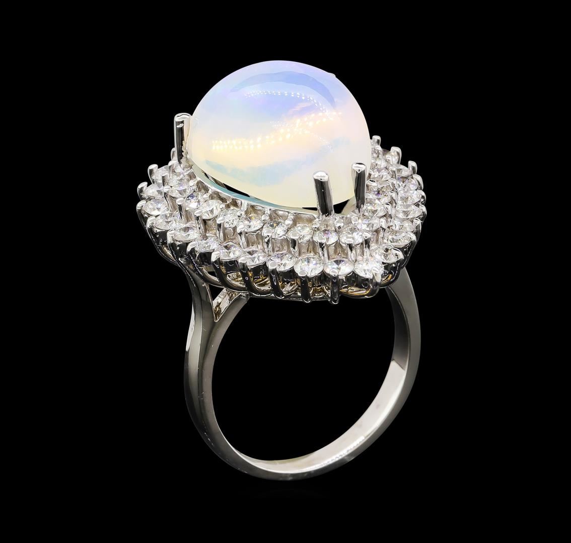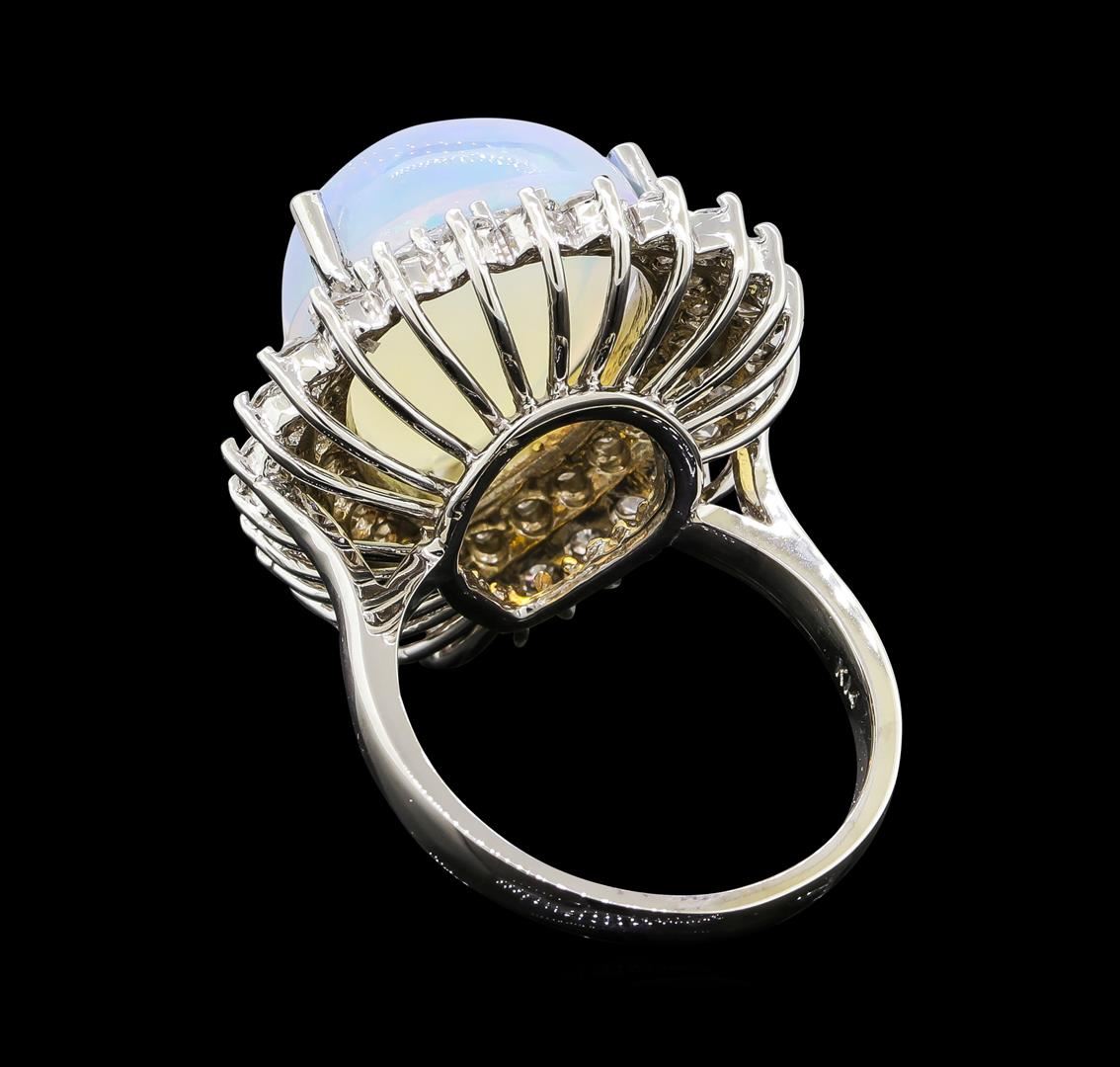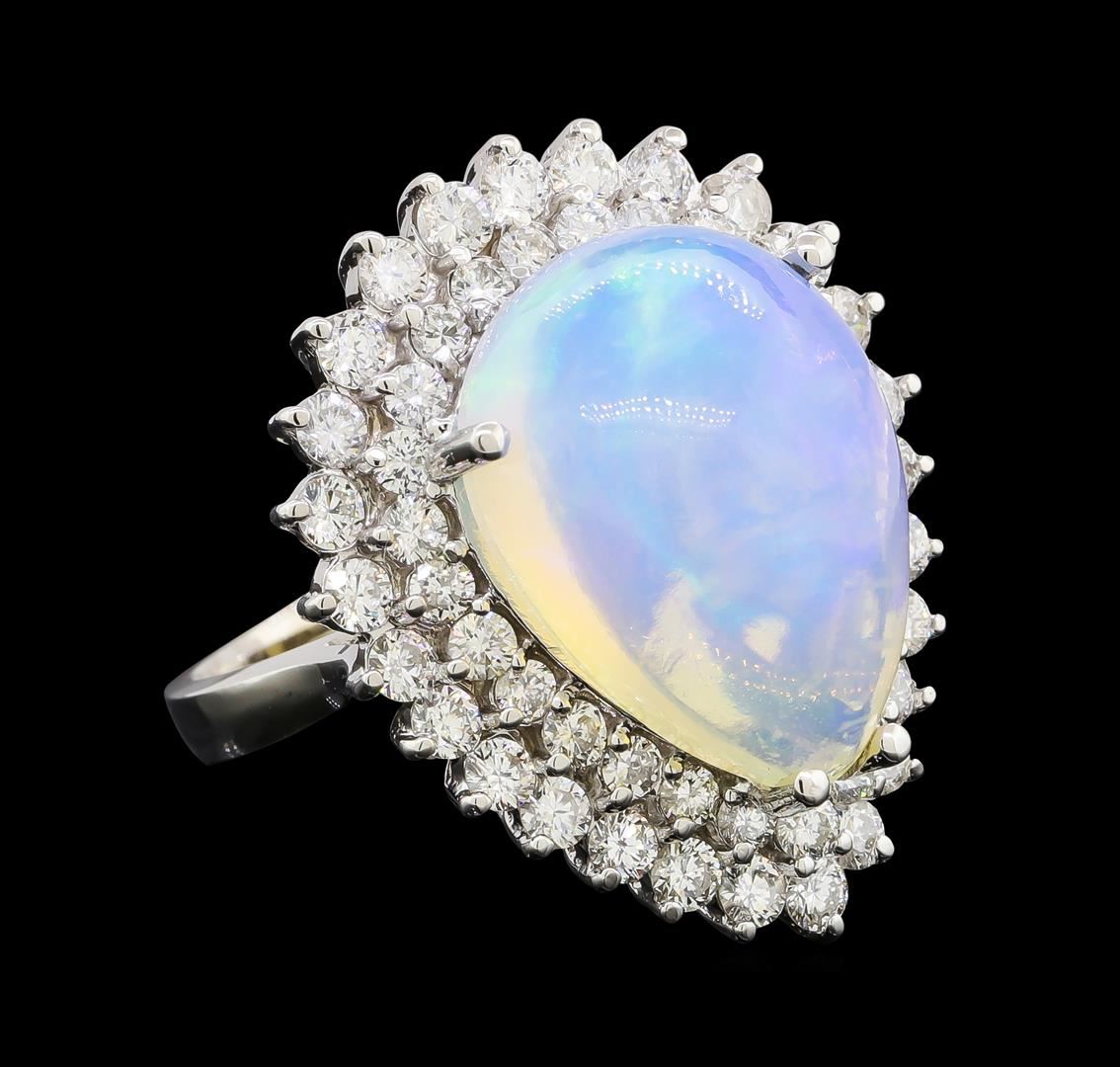 One electronically tested 14KT white gold lady's cast fashion ring with a double basket halo with a bright polish finish. The featured lady's ring has a shank measuring 2.46 millimeters wide. Identified with markings of 'K14'. Condition is new, good workmanship. Containing: One crystal opal that is cut in a pear shaped cabochon and is prong set, measuring 18.20 mm long x 13.42 mm wide, and 8.98 mm thick and the approximate weight is 9.75 carats. The opal has a bright, blue-green play of color (fire) in a rolling flashfire pattern; a high dome; a good cut; no inclusions; consistent in its brightness and pattern; and is not directional. Graded in the setting. Twenty-Seven prong set round brilliant cut diamonds, measuring 2.40 - 2.30 x 1.41mm (depth est.) approximate total weight of 27 Stones = 1.28ct. Graded in the setting. Clarity SI-1 to I-1. Color: G - H Cut Good Twenty-Six prong set round brilliant cut diamonds, measuring 2.10 - 2.00 x 1.27mm (depth est.) approximate total weight of 26 Stones = 0.86ct. Graded in the setting. Clarity SI-1 to SI-2. Color: H - I Cut Good. Total Weight of Diamonds 2.14ct.. Total Weight of Opals 9.75ct.. Total Weight of Ring 10.10gm. GAS Appraised at $8,305.00.