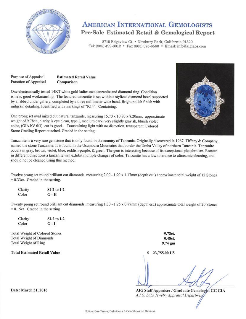 One electronically tested 14KT white gold ladies cast tanzanite and diamond ring. The featured tanzanite is set within a stylized diamond bezel supported by a ribbed under gallery, completed by a three millimeter wide band. Bright polish finish with milgrain detailing. Identified with markings of "K14". Condition is new, good workmanship. Containing: One prong set oval mixed cut natural tanzanite, measuring 15.70 x 10.80 x 8.20mm, approximate weight of 9.78ct., clarity is eye clean, type I, medium dark, very slightly grayish, bluish violet color, (GIA bV 6/3), cut is good. Transmitting light with no distortion, transparent. Colored Stone Grading Report attached. Graded in the setting. Tanzanite is a very rare gemstone that is only found in the country of Tanzania. Originally discovered in 1967. Tiffany & Company, named the stone Tanzanite. It is found in the Usumburu Mountains that border the Umba Valley of northern Tanzania. Tanzanite occurs in gray, brown, violet, blue, reddish-purple, & green. The gem is interesting because of its exceptional pleochroism. Rotated in different directions a tanzanite will exhibit multiple changes of color. Tanzanite has a low tolerance to ultrasonic cleaning, and should not be cleaned using this method. Twelve prong set round brilliant cut diamonds, measuring 2.00 - 1.90 x 1.17mm (depth est.) approximate total weight of 12 Stones = 0.33ct. Graded in the setting. Clarity: SI-2 to I-2. Color: G - H Twenty prong set round brilliant cut diamonds, measuring 1.30 - 1.25 x 0.77mm (depth est.) approximate total weight of 20 Stones = 0.15ct. Graded in the setting. Clarity: SI-2 to I-2. Color: G - I. Total Weight of Colored Stones 9.78ct. Total Weight of Diamonds 0.48ct. Total Weight of Ring 9.74gm. AIG Appraised at $23,755.00.