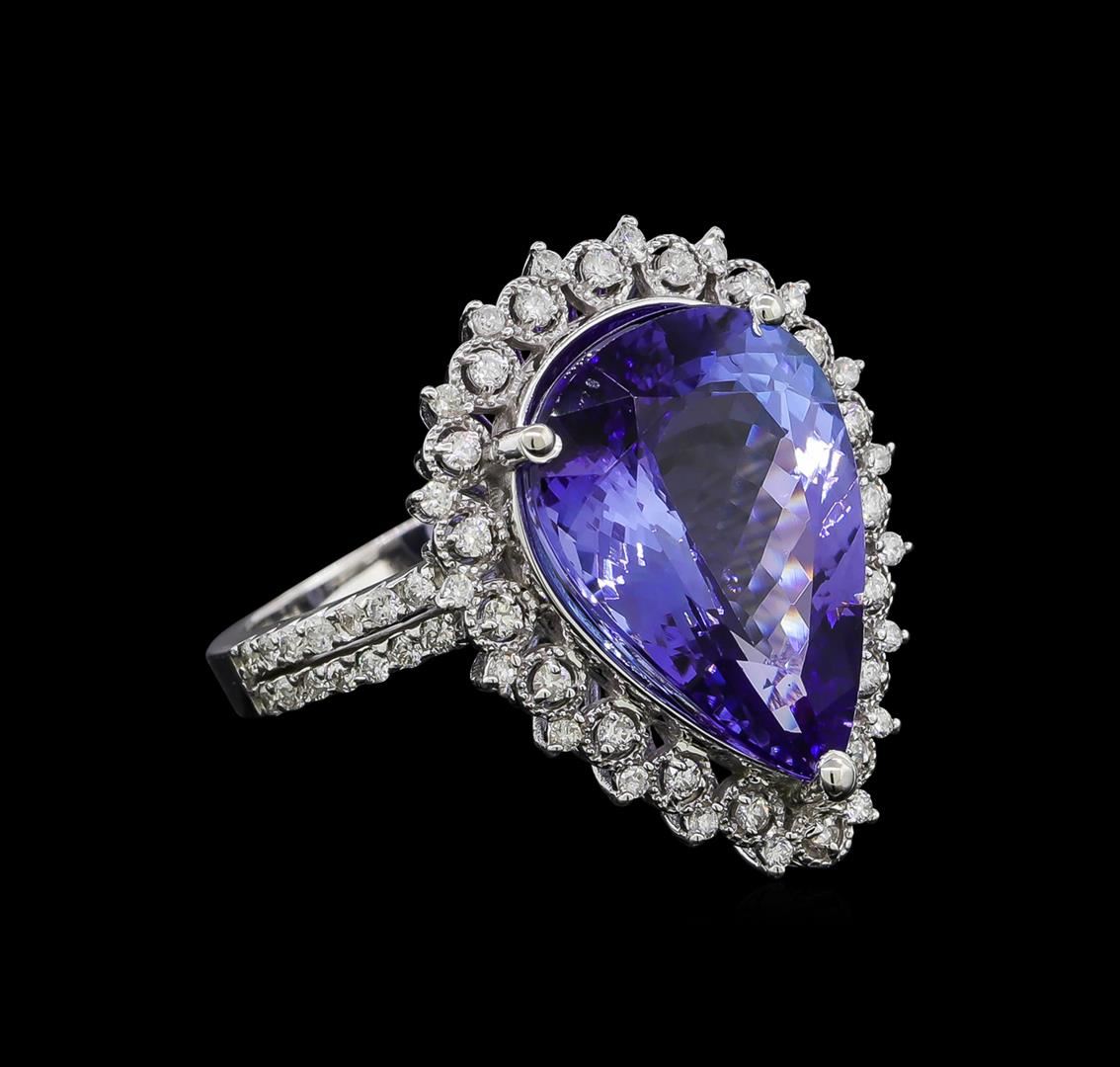 One electronically tested 14KT white gold lady's cast fashion ring with a split shank double basket halo with a bright polish with milgrain detailing finish. The featured lady's ring has a shank measuring 2.23 millimeters wide. Identified with markings of '14K'. Condition is new, good workmanship. Containing: One prong set pear modified brilliant cut natural tanzanite, measuring 16.95 x 12.13 x 7.28mm, (depth est.) approximate weight of 9.78ct., clarity is eye clean, medium, moderately strong, violetish blue color, (GIA vB 5/4), cut is very good. Transmitting light with no distortion, transparent. Colored gemstones are presumed to have been subjected to commonly used enhancement processes. Graded in the setting. Nineteen prong set round brilliant cut diamonds, measuring 1.60 - 1.50 x 0.96mm (depth est.) approximate total weight of 19 Stones = 0.27ct. Graded in the setting. Clarity SI-1 to I-1. Color: H - I Cut Good Twenty-Eight prong set round brilliant cut diamonds, measuring 1.35 - 1.25 x 0.81mm (depth est.) approximate total weight of 28 Stones = 0.24ct. Graded in the setting. Clarity SI-1 to I-1. Color: H - I Cut Good Nineteen prong set round brilliant cut diamonds, measuring 1.25 - 1.15 x 0.72mm (depth est.) approximate total weight of 19 Stones = 0.12ct. Graded in the setting. Clarity SI-1 to I-1. Color: H - I Cut Good. Total Weight of Colored Stones 9.78ct.. Total Weight of Diamonds 0.63ct.. Total Weight of Ring 7.90gm GAS Appraised at $18,435.00.