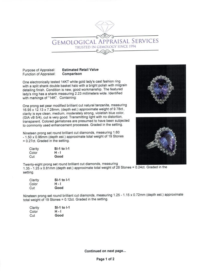 One electronically tested 14KT white gold lady's cast fashion ring with a split shank double basket halo with a bright polish with milgrain detailing finish. The featured lady's ring has a shank measuring 2.23 millimeters wide. Identified with markings of '14K'. Condition is new, good workmanship. Containing: One prong set pear modified brilliant cut natural tanzanite, measuring 16.95 x 12.13 x 7.28mm, (depth est.) approximate weight of 9.78ct., clarity is eye clean, medium, moderately strong, violetish blue color, (GIA vB 5/4), cut is very good. Transmitting light with no distortion, transparent. Colored gemstones are presumed to have been subjected to commonly used enhancement processes. Graded in the setting. Nineteen prong set round brilliant cut diamonds, measuring 1.60 - 1.50 x 0.96mm (depth est.) approximate total weight of 19 Stones = 0.27ct. Graded in the setting. Clarity SI-1 to I-1. Color: H - I Cut Good Twenty-Eight prong set round brilliant cut diamonds, measuring 1.35 - 1.25 x 0.81mm (depth est.) approximate total weight of 28 Stones = 0.24ct. Graded in the setting. Clarity SI-1 to I-1. Color: H - I Cut Good Nineteen prong set round brilliant cut diamonds, measuring 1.25 - 1.15 x 0.72mm (depth est.) approximate total weight of 19 Stones = 0.12ct. Graded in the setting. Clarity SI-1 to I-1. Color: H - I Cut Good. Total Weight of Colored Stones 9.78ct.. Total Weight of Diamonds 0.63ct.. Total Weight of Ring 7.90gm GAS Appraised at $18,435.00.