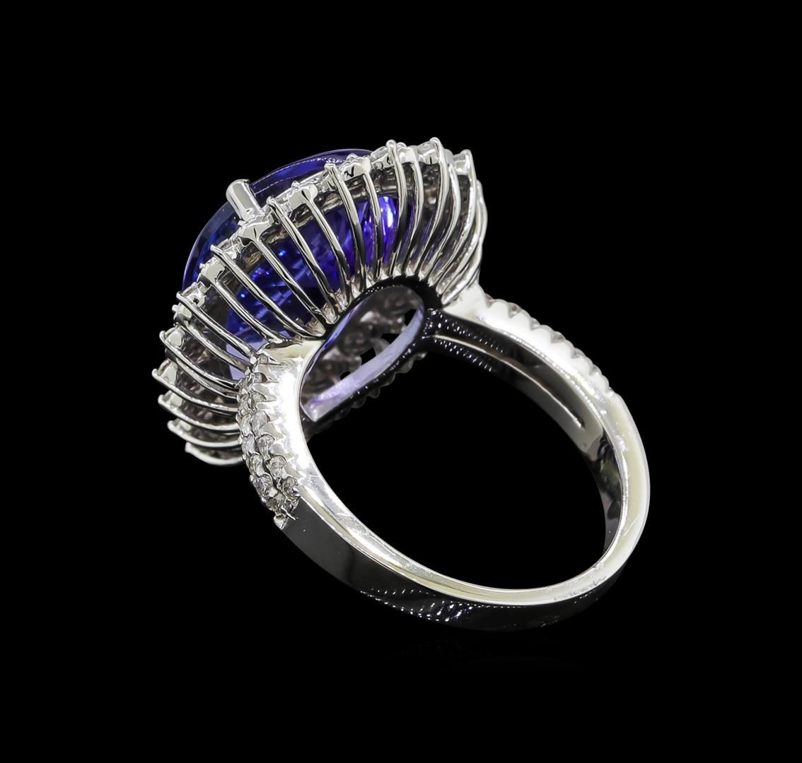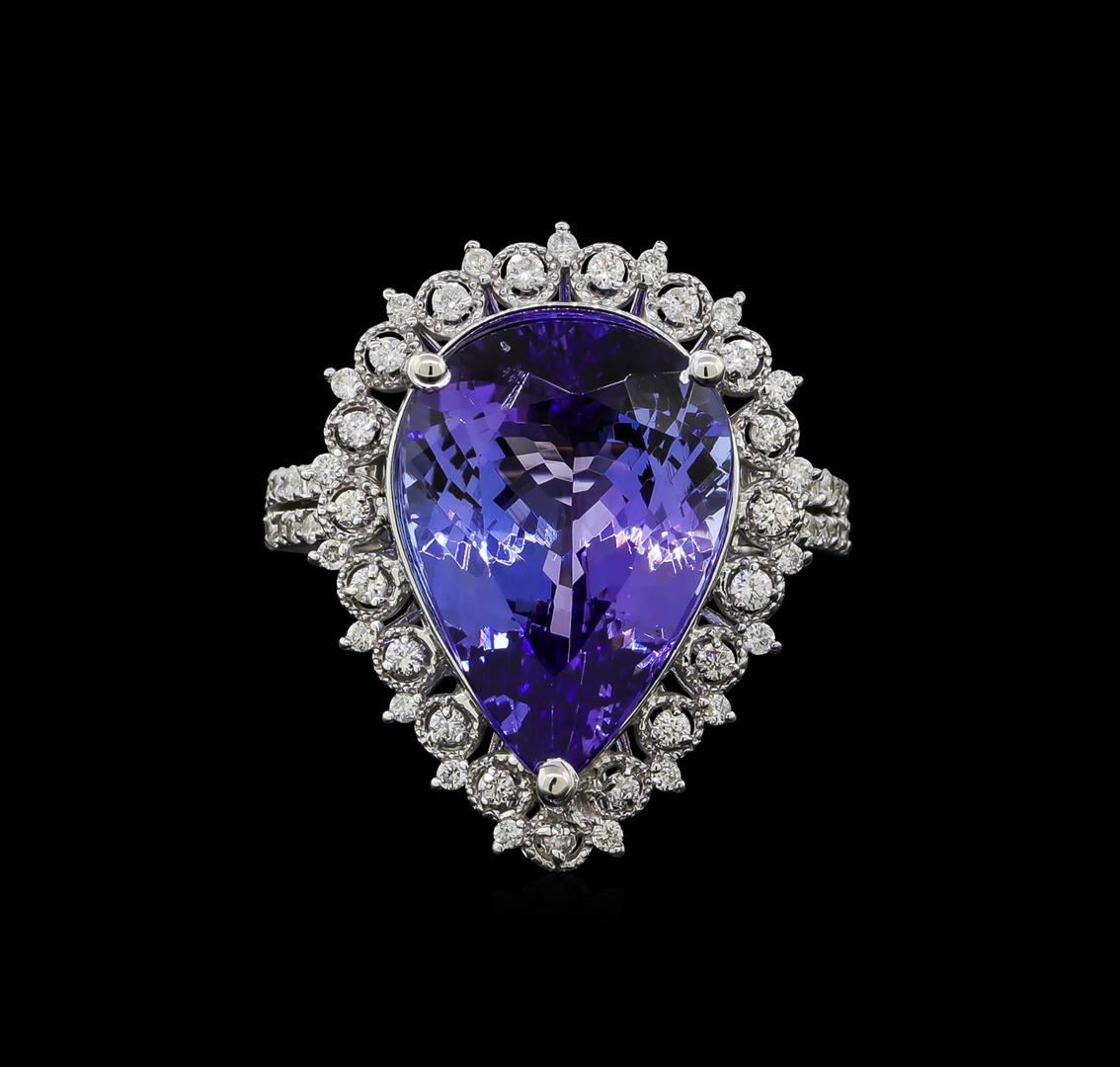 One electronically tested 14KT white gold lady's cast fashion ring with a split shank double basket halo with a bright polish with milgrain detailing finish. The featured lady's ring has a shank measuring 2.23 millimeters wide. Identified with markings of '14K'. Condition is new, good workmanship. Containing: One prong set pear modified brilliant cut natural tanzanite, measuring 16.95 x 12.13 x 7.28mm, (depth est.) approximate weight of 9.78ct., clarity is eye clean, medium, moderately strong, violetish blue color, (GIA vB 5/4), cut is very good. Transmitting light with no distortion, transparent. Colored gemstones are presumed to have been subjected to commonly used enhancement processes. Graded in the setting. Nineteen prong set round brilliant cut diamonds, measuring 1.60 - 1.50 x 0.96mm (depth est.) approximate total weight of 19 Stones = 0.27ct. Graded in the setting. Clarity SI-1 to I-1. Color: H - I Cut Good Twenty-Eight prong set round brilliant cut diamonds, measuring 1.35 - 1.25 x 0.81mm (depth est.) approximate total weight of 28 Stones = 0.24ct. Graded in the setting. Clarity SI-1 to I-1. Color: H - I Cut Good Nineteen prong set round brilliant cut diamonds, measuring 1.25 - 1.15 x 0.72mm (depth est.) approximate total weight of 19 Stones = 0.12ct. Graded in the setting. Clarity SI-1 to I-1. Color: H - I Cut Good. Total Weight of Colored Stones 9.78ct.. Total Weight of Diamonds 0.63ct.. Total Weight of Ring 7.90gm GAS Appraised at $18,435.00.