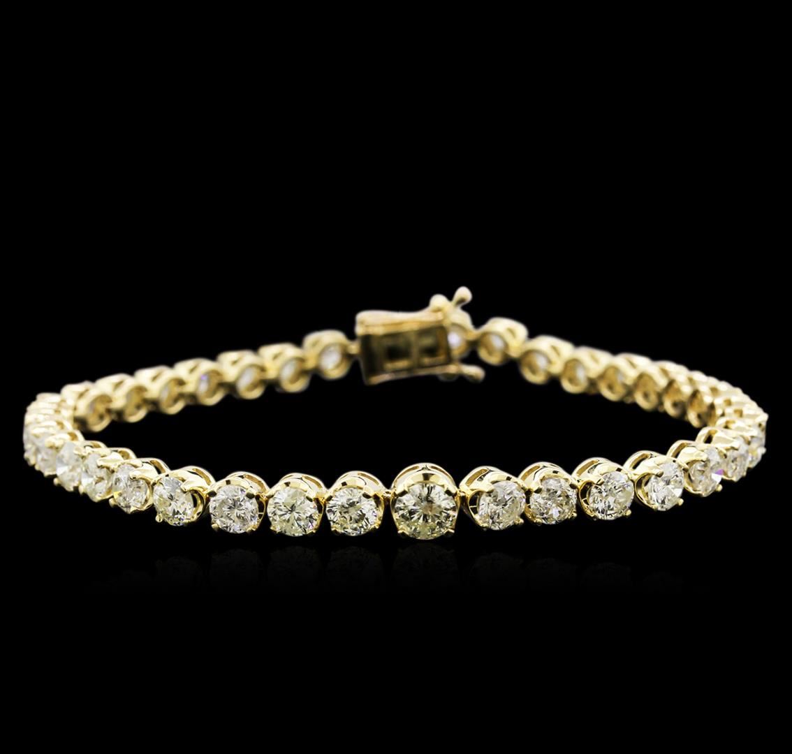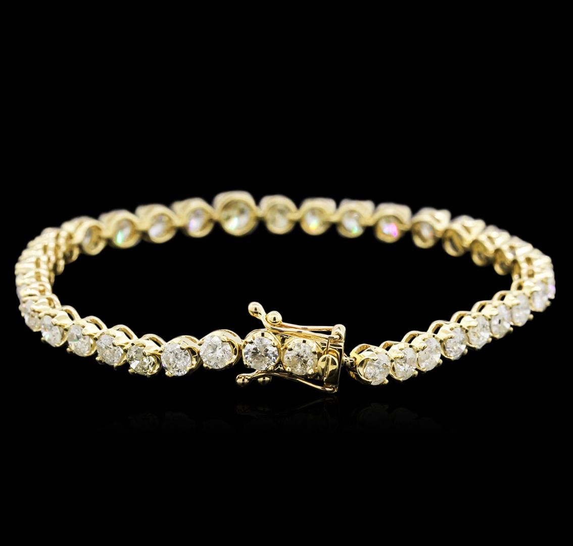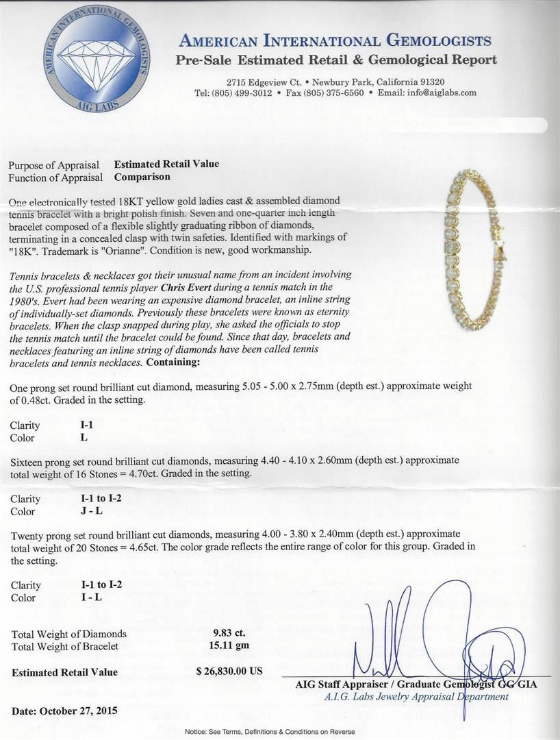 One electronically tested 18KT yellow gold ladies cast & assembled diamond tennis bracelet with a bright polish finish. Seven and one-quarter inch length bracelet composed of a flexible slightly graduating ribbon of diamonds, terminating in a concealed clasp with twin safeties. Identified with markings of "18K". Trademark is "Orianne". Condition is new, good workmanship. Tennis bracelets & necklaces got their unusual name from an incident involving the U.S. professional tennis player Chris Evert during a tennis match in the 1980's. Evert had been wearing an expensive diamond bracelet, an inline string of individually-set diamonds. Previously these bracelets were known as eternity bracelets. When the clasp snapped during play, she asked the officials to stop the tennis match until the bracelet could be found. Since that day, bracelets and necklaces featuring an inline string of diamonds have been called tennis bracelets and tennis necklaces. Containing: One prong set round brilliant cut diamond, measuring 5.05 - 5.00 x 2.75mm (depth est.) approximate weight of 0.48ct. Graded in the setting. Clarity: I-1. Color: L Sixteen prong set round brilliant cut diamonds, measuring 4.40 - 4.10 x 2.60mm (depth est.) approximate total weight of 16 Stones = 4.70ct. Graded in the setting. Clarity: I-1 to I-2. Color: J - L Twenty prong set round brilliant cut diamonds, measuring 4.00 - 3.80 x 2.40mm (depth est.) approximate total weight of 20 Stones = 4.65ct. The color grade reflects the entire range of color for this group. Graded in the setting. Clarity: I-1 to I-2. Color: I - L. Total Weight of Diamonds 9.83ct. Total Weight of Bracelet 15.11gm. AIG Appraised at $26,830.00.