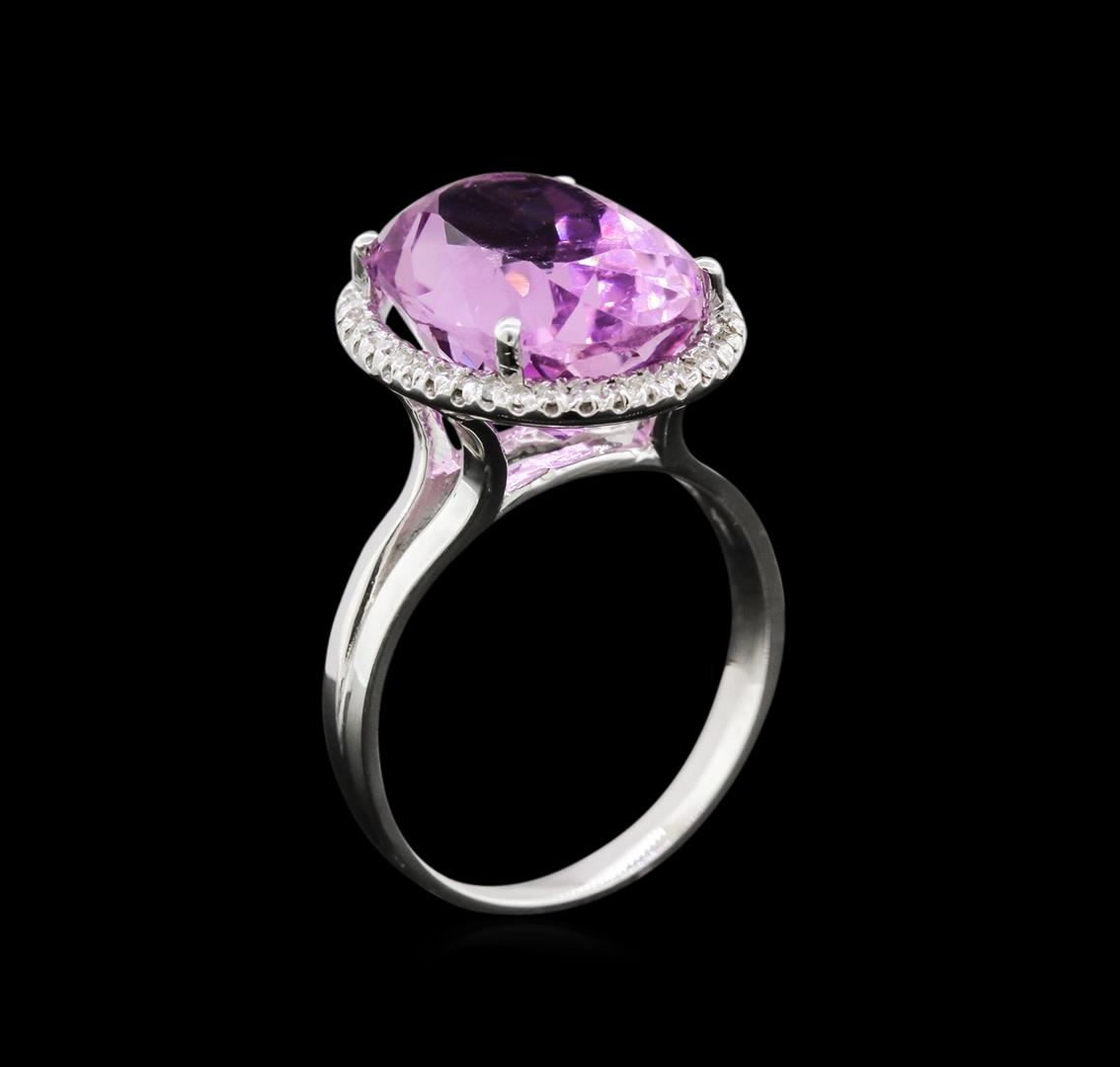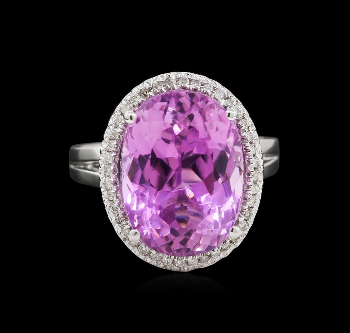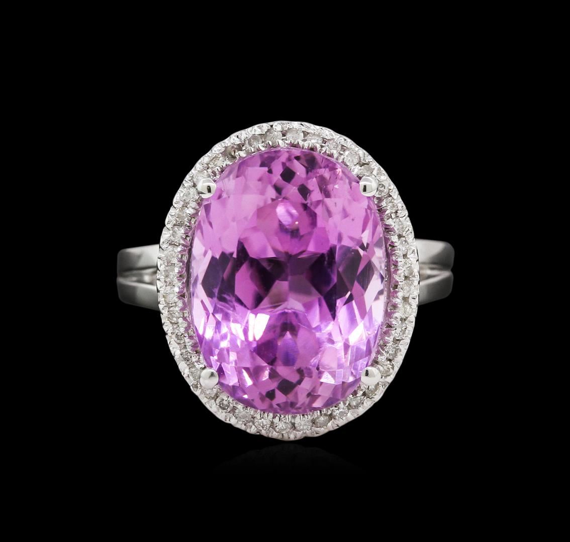 One 14K White Gold Lady's Ring. 5.70 GR. Containing: Main Gemstones: Identity: Kunzite. Carat Weight 9.84 CTS TW. Shape & Measurement: Oval Shape. Quality: Fine Color. Adjacent Gemstones: Identity: Natural Diamond. Shape: Round Cut. Carat Weight: 0.15 CTS TW. Quality: SI Clarity, G-H Color. All Fine Cutting And Proportions. Total Gemstones Weight: 9.99 CTW TW. RBGS Appraised.