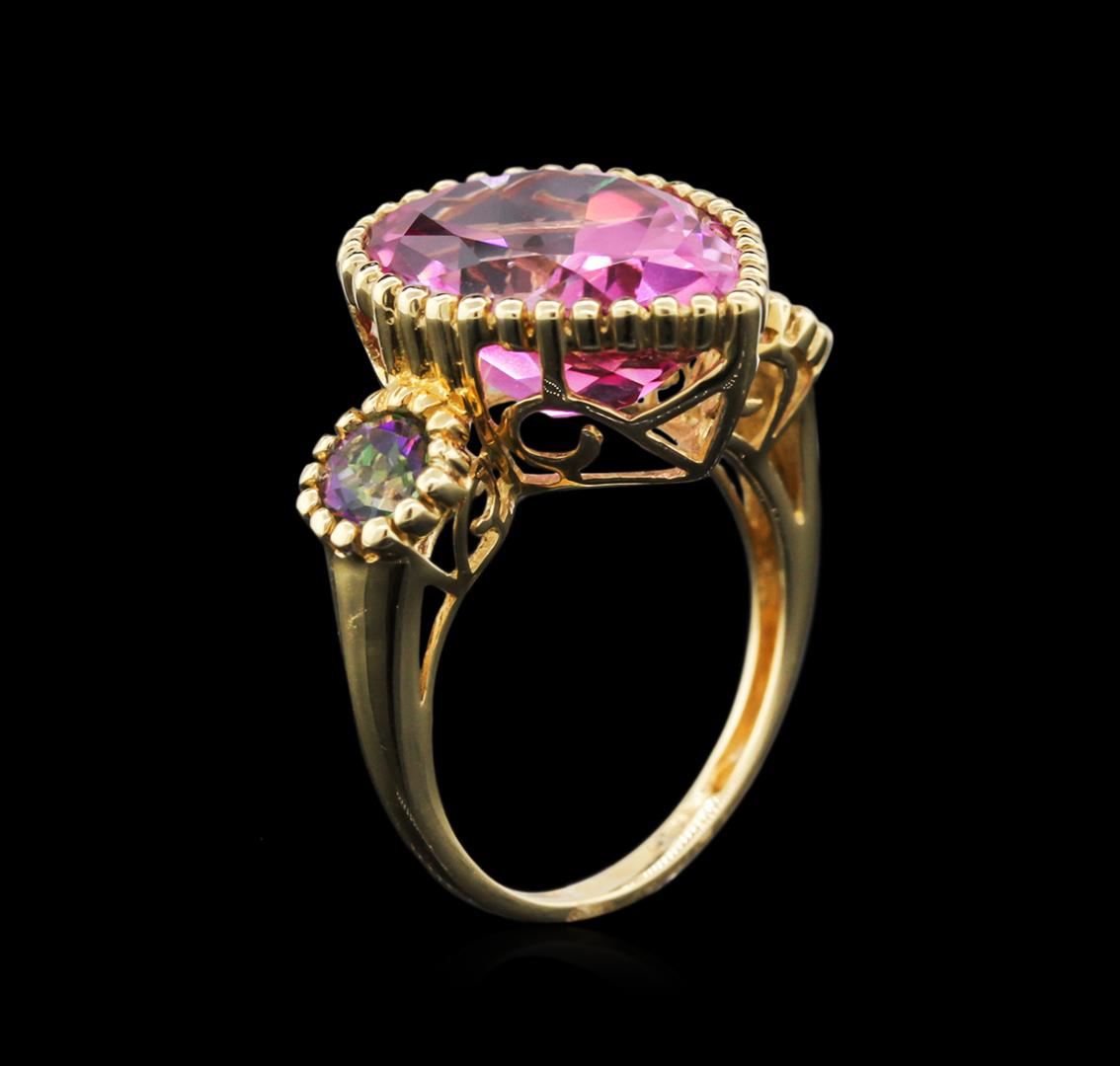 One 14KT Yellow Gold Pink Zircon and Mystic Topaz Ring: One Pear Pink Zircon: Measures: 15.90 x 11.80 x 8.00 mm. Carat Weight: 9.86cts. Clarity: Eye Clean. Color: Pink. Two Round Mystic Topaz: Measures: 4.50 x 4.40 x 3.00 mm. Carat Weight: 0.88cts. Clarity: Eye Clean. Color: Bluish Green. Total Weight of Gemstone: 10.74cts. Total Weight of Item: 5.66gm. AIG Appraised at $3,445.00.