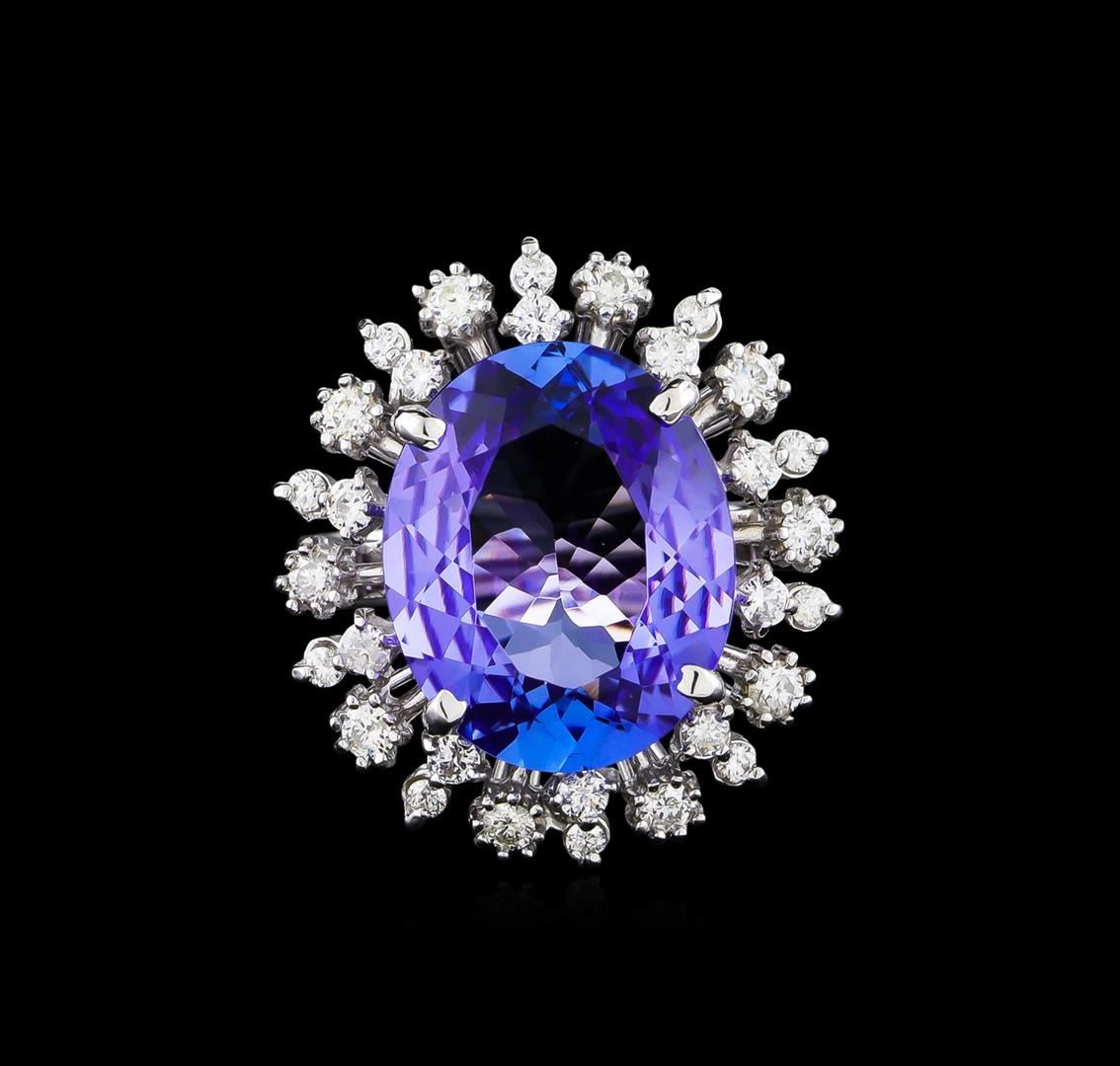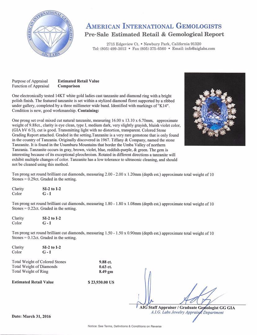 One electronically tested 14KT white gold ladies cast tanzanite and diamond ring with a bright polish finish. The featured tanzanite is set within a stylized diamond floret supported by a ribbed under gallery, completed by a three millimeter wide band. Identified with markings of "K14". Condition is new, good workmanship. Containing: One prong set oval mixed cut natural tanzanite, measuring 16.00 x 13.10 x 6.70mm, approximate weight of 9.88ct., clarity is eye clean, type I, medium dark, very slightly grayish, bluish violet color, (GIA bV 6/3), cut is good. Transmitting light with no distortion, transparent. Colored Stone Grading Report attached. Graded in the setting. Tanzanite is a very rare gemstone that is only found in the country of Tanzania. Originally discovered in 1967. Tiffany & Company, named the stone Tanzanite. It is found in the Usumburu Mountains that border the Umba Valley of northern Tanzania. Tanzanite occurs in gray, brown, violet, blue, reddish-purple, & green. The gem is interesting because of its exceptional pleochroism. Rotated in different directions a tanzanite will exhibit multiple changes of color. Tanzanite has a low tolerance to ultrasonic cleaning, and should not be cleaned using this method. Ten prong set round brilliant cut diamonds, measuring 2.00 - 2.00 x 1.20mm (depth est.) approximate total weight of 10 Stones = 0.29ct. Graded in the setting. Clarity: SI-2 to I-2. Color: G - I Ten prong set round brilliant cut diamonds, measuring 1.80 - 1.80 x 1.08mm (depth est.) approximate total weight of 10 Stones = 0.22ct. Graded in the setting. Clarity: SI-2 to I-2. Color: G - I Ten prong set round brilliant cut diamonds, measuring 1.50 - 1.50 x 0.90mm (depth est.) approximate total weight of 10 Stones = 0.12ct. Graded in the setting. Clarity: SI-2 to I-2. Color: G - I. Total Weight of Colored Stones 9.88ct. Total Weight of Diamonds 0.63ct. Total Weight of Ring 8.49gm. AIG Appraised at $23,930.00.