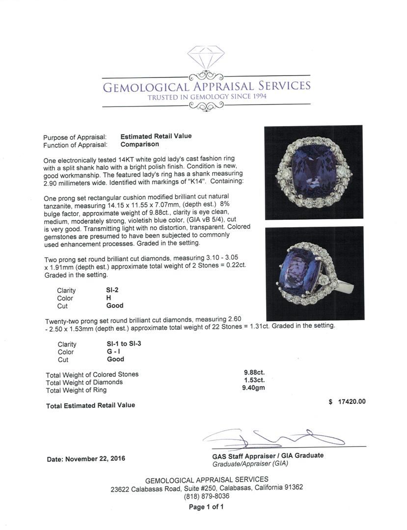 One electronically tested 14KT white gold lady's cast fashion ring with a split shank halo with a bright polish finish. The featured lady's ring has a shank measuring 2.90 millimeters wide. Identified with markings of 'K14'. Condition is new, good workmanship. Containing: One prong set rectangular cushion modified brilliant cut natural tanzanite, measuring 14.15 x 11.55 x 7.07mm, (depth est.) 8%. bulge factor, approximate weight of 9.88ct., clarity is eye clean, medium, moderately strong, violetish blue color, (GIA vB 5/4), cut is very good. Transmitting light with no distortion, transparent. Colored gemstones are presumed to have been subjected to commonly used enhancement processes. Graded in the setting. Two prong set round brilliant cut diamonds, measuring 3.10 - 3.05 x 1.91mm (depth est.) approximate total weight of 2 Stones = 0.22ct. Graded in the setting. Clarity SI-2. Color: H Cut Good Twenty-Two prong set round brilliant cut diamonds, measuring 2.60 - 2.50 x 1.53mm (depth est.) approximate total weight of 22 Stones = 1.31ct. Graded in the setting. Clarity SI-1 to SI-3. Color: G - I Cut Good. Total Weight of Colored Stones 9.88ct.. Total Weight of Diamonds 1.53ct.. Total Weight of Ring 9.40gm. GAS Appraised at $17,420.00.