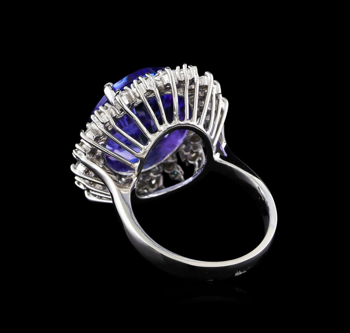 One electronically tested 14KT white gold ladies cast tanzanite and diamond ring with a bright polish finish. The featured tanzanite is set within a stylized diamond floret supported by a ribbed under gallery, completed by a three millimeter wide band. Identified with markings of "K14". Condition is new, good workmanship. Containing: One prong set oval mixed cut natural tanzanite, measuring 16.00 x 13.10 x 6.70mm, approximate weight of 9.88ct., clarity is eye clean, type I, medium dark, very slightly grayish, bluish violet color, (GIA bV 6/3), cut is good. Transmitting light with no distortion, transparent. Colored Stone Grading Report attached. Graded in the setting. Tanzanite is a very rare gemstone that is only found in the country of Tanzania. Originally discovered in 1967. Tiffany & Company, named the stone Tanzanite. It is found in the Usumburu Mountains that border the Umba Valley of northern Tanzania. Tanzanite occurs in gray, brown, violet, blue, reddish-purple, & green. The gem is interesting because of its exceptional pleochroism. Rotated in different directions a tanzanite will exhibit multiple changes of color. Tanzanite has a low tolerance to ultrasonic cleaning, and should not be cleaned using this method. Ten prong set round brilliant cut diamonds, measuring 2.00 - 2.00 x 1.20mm (depth est.) approximate total weight of 10 Stones = 0.29ct. Graded in the setting. Clarity: SI-2 to I-2. Color: G - I Ten prong set round brilliant cut diamonds, measuring 1.80 - 1.80 x 1.08mm (depth est.) approximate total weight of 10 Stones = 0.22ct. Graded in the setting. Clarity: SI-2 to I-2. Color: G - I Ten prong set round brilliant cut diamonds, measuring 1.50 - 1.50 x 0.90mm (depth est.) approximate total weight of 10 Stones = 0.12ct. Graded in the setting. Clarity: SI-2 to I-2. Color: G - I. Total Weight of Colored Stones 9.88ct. Total Weight of Diamonds 0.63ct. Total Weight of Ring 8.49gm. AIG Appraised at $23,930.00.