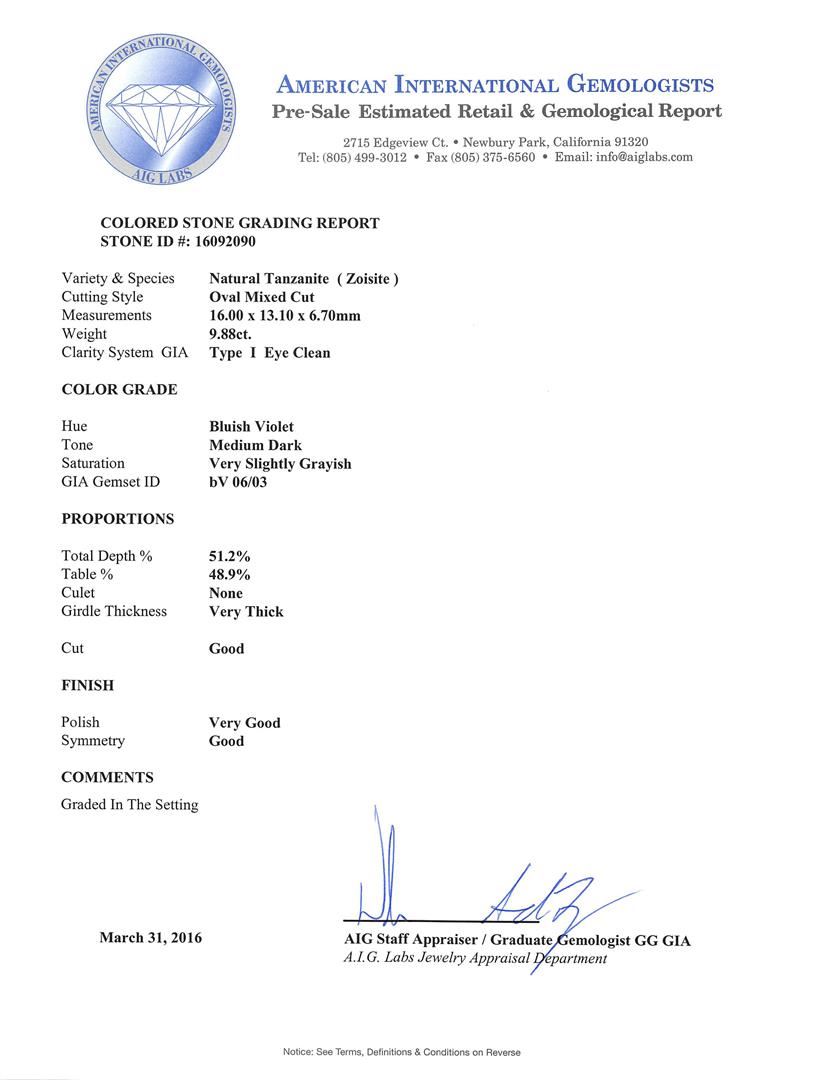 One electronically tested 14KT white gold ladies cast tanzanite and diamond ring with a bright polish finish. The featured tanzanite is set within a stylized diamond floret supported by a ribbed under gallery, completed by a three millimeter wide band. Identified with markings of "K14". Condition is new, good workmanship. Containing: One prong set oval mixed cut natural tanzanite, measuring 16.00 x 13.10 x 6.70mm, approximate weight of 9.88ct., clarity is eye clean, type I, medium dark, very slightly grayish, bluish violet color, (GIA bV 6/3), cut is good. Transmitting light with no distortion, transparent. Colored Stone Grading Report attached. Graded in the setting. Tanzanite is a very rare gemstone that is only found in the country of Tanzania. Originally discovered in 1967. Tiffany & Company, named the stone Tanzanite. It is found in the Usumburu Mountains that border the Umba Valley of northern Tanzania. Tanzanite occurs in gray, brown, violet, blue, reddish-purple, & green. The gem is interesting because of its exceptional pleochroism. Rotated in different directions a tanzanite will exhibit multiple changes of color. Tanzanite has a low tolerance to ultrasonic cleaning, and should not be cleaned using this method. Ten prong set round brilliant cut diamonds, measuring 2.00 - 2.00 x 1.20mm (depth est.) approximate total weight of 10 Stones = 0.29ct. Graded in the setting. Clarity: SI-2 to I-2. Color: G - I Ten prong set round brilliant cut diamonds, measuring 1.80 - 1.80 x 1.08mm (depth est.) approximate total weight of 10 Stones = 0.22ct. Graded in the setting. Clarity: SI-2 to I-2. Color: G - I Ten prong set round brilliant cut diamonds, measuring 1.50 - 1.50 x 0.90mm (depth est.) approximate total weight of 10 Stones = 0.12ct. Graded in the setting. Clarity: SI-2 to I-2. Color: G - I. Total Weight of Colored Stones 9.88ct. Total Weight of Diamonds 0.63ct. Total Weight of Ring 8.49gm. AIG Appraised at $23,930.00.