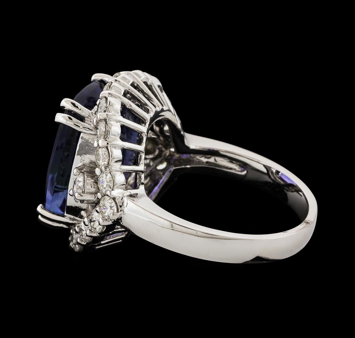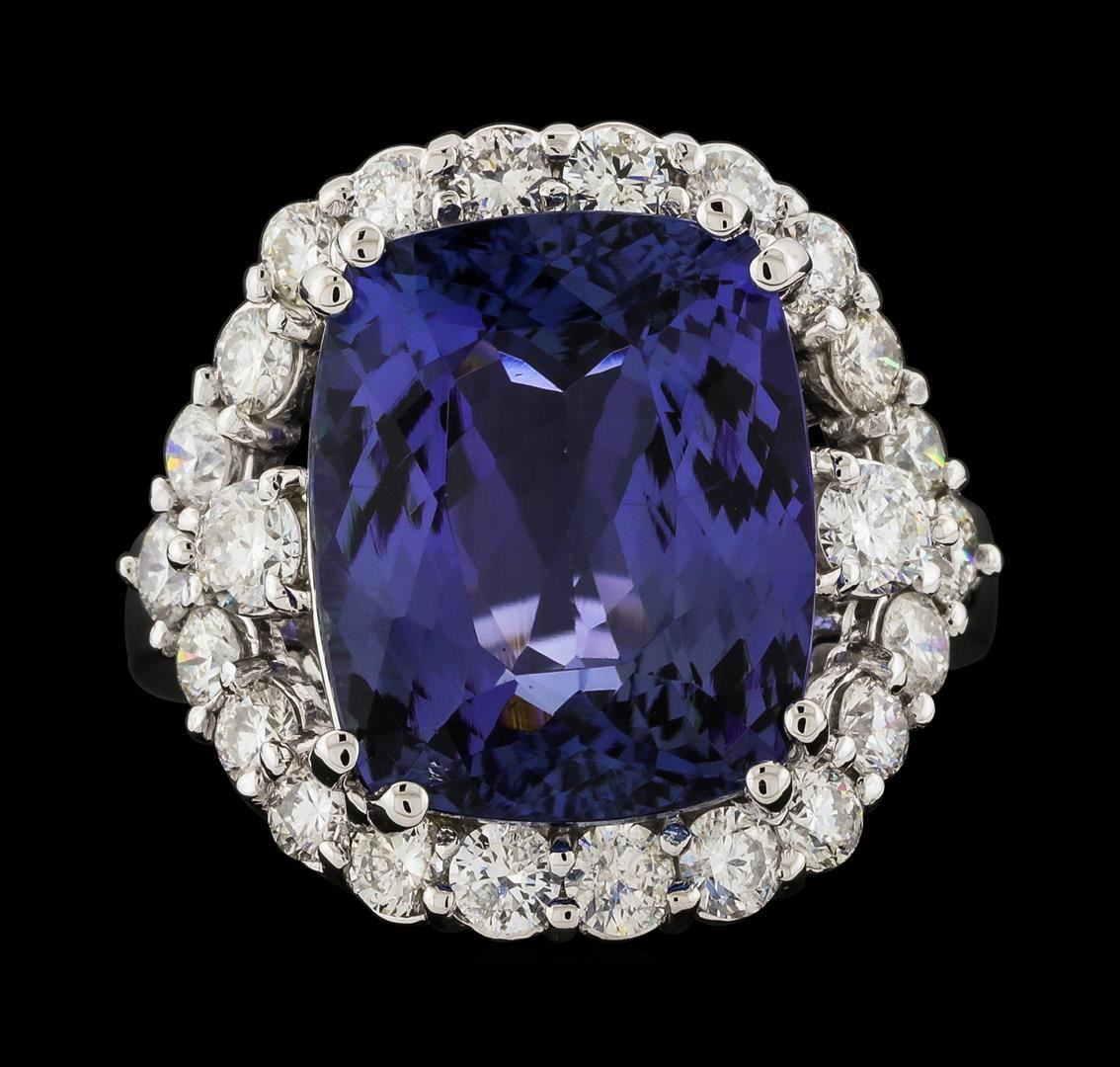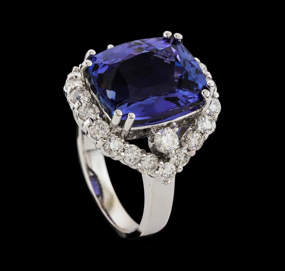 One electronically tested 14KT white gold lady's cast fashion ring with a split shank halo with a bright polish finish. The featured lady's ring has a shank measuring 2.90 millimeters wide. Identified with markings of 'K14'. Condition is new, good workmanship. Containing: One prong set rectangular cushion modified brilliant cut natural tanzanite, measuring 14.15 x 11.55 x 7.07mm, (depth est.) 8%. bulge factor, approximate weight of 9.88ct., clarity is eye clean, medium, moderately strong, violetish blue color, (GIA vB 5/4), cut is very good. Transmitting light with no distortion, transparent. Colored gemstones are presumed to have been subjected to commonly used enhancement processes. Graded in the setting. Two prong set round brilliant cut diamonds, measuring 3.10 - 3.05 x 1.91mm (depth est.) approximate total weight of 2 Stones = 0.22ct. Graded in the setting. Clarity SI-2. Color: H Cut Good Twenty-Two prong set round brilliant cut diamonds, measuring 2.60 - 2.50 x 1.53mm (depth est.) approximate total weight of 22 Stones = 1.31ct. Graded in the setting. Clarity SI-1 to SI-3. Color: G - I Cut Good. Total Weight of Colored Stones 9.88ct.. Total Weight of Diamonds 1.53ct.. Total Weight of Ring 9.40gm. GAS Appraised.