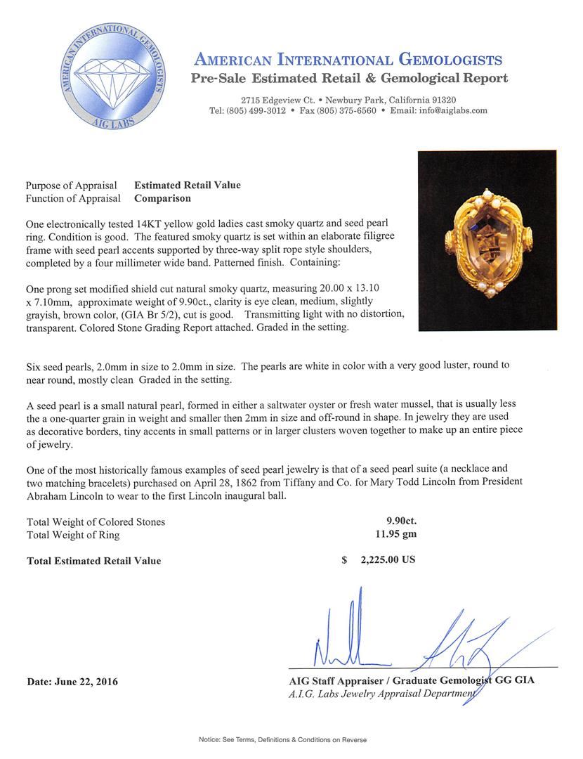 One electronically tested 14KT yellow gold ladies cast smoky quartz and seed pearl ring. The featured smoky quartz is set within an elaborate filigree frame with seed pearl accents supported by three-way split rope style shoulders, completed by a four millimeter wide band. Patterned finish. Condition is good. Containing: One prong set modified shield cut natural smoky quartz, measuring 20.00. x 13.10 x 7.10mm, approximate weight of 9.90ct., clarity is eye clean, medium, slightly grayish, brown color, (GIA Br 5/2), cut is good. Transmitting light with no distortion, transparent. Colored Stone Grading Report attached. Graded in the setting. Six seed pearls, 2.0mm in size to 2.0mm in size. The pearls are white in color with a very good luster, round to near round, mostly clean Graded in the setting. A seed pearl is a small natural pearl, formed in either a saltwater oyster or fresh water mussel, that is usually less the a one-quarter grain in weight and smaller then 2mm in size and off-round in shape. In jewelry they are used as decorative borders, tiny accents in small patterns or in larger clusters woven together to make up an entire piece of jewelry. One of the most historically famous examples of seed pearl jewelry is that of a seed pearl suite (a necklace and two matching bracelets) purchased on April 28, 1862 from Tiffany and Co. for Mary Todd Lincoln from President Abraham Lincoln to wear to the first Lincoln inaugural ball.. Total Weight of Colored Stones 9.90ct.. Total Weight of Ring 11.95gm. AIG Appraised at $2,225.00.