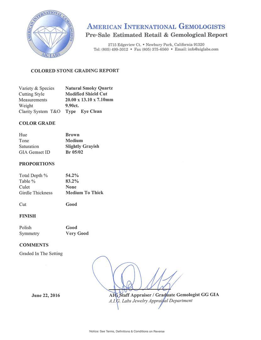 One electronically tested 14KT yellow gold ladies cast smoky quartz and seed pearl ring. The featured smoky quartz is set within an elaborate filigree frame with seed pearl accents supported by three-way split rope style shoulders, completed by a four millimeter wide band. Patterned finish. Condition is good. Containing: One prong set modified shield cut natural smoky quartz, measuring 20.00. x 13.10 x 7.10mm, approximate weight of 9.90ct., clarity is eye clean, medium, slightly grayish, brown color, (GIA Br 5/2), cut is good. Transmitting light with no distortion, transparent. Colored Stone Grading Report attached. Graded in the setting. Six seed pearls, 2.0mm in size to 2.0mm in size. The pearls are white in color with a very good luster, round to near round, mostly clean Graded in the setting. A seed pearl is a small natural pearl, formed in either a saltwater oyster or fresh water mussel, that is usually less the a one-quarter grain in weight and smaller then 2mm in size and off-round in shape. In jewelry they are used as decorative borders, tiny accents in small patterns or in larger clusters woven together to make up an entire piece of jewelry. One of the most historically famous examples of seed pearl jewelry is that of a seed pearl suite (a necklace and two matching bracelets) purchased on April 28, 1862 from Tiffany and Co. for Mary Todd Lincoln from President Abraham Lincoln to wear to the first Lincoln inaugural ball.. Total Weight of Colored Stones 9.90ct.. Total Weight of Ring 11.95gm. AIG Appraised at $2,225.00.