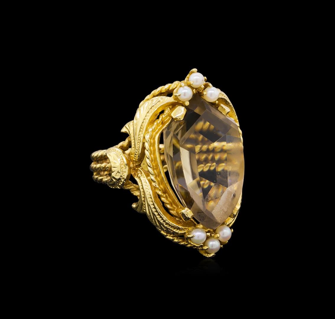 One electronically tested 14KT yellow gold ladies cast smoky quartz and seed pearl ring. The featured smoky quartz is set within an elaborate filigree frame with seed pearl accents supported by three-way split rope style shoulders, completed by a four millimeter wide band. Patterned finish. Condition is good. Containing: One prong set modified shield cut natural smoky quartz, measuring 20.00. x 13.10 x 7.10mm, approximate weight of 9.90ct., clarity is eye clean, medium, slightly grayish, brown color, (GIA Br 5/2), cut is good. Transmitting light with no distortion, transparent. Colored Stone Grading Report attached. Graded in the setting. Six seed pearls, 2.0mm in size to 2.0mm in size. The pearls are white in color with a very good luster, round to near round, mostly clean Graded in the setting. A seed pearl is a small natural pearl, formed in either a saltwater oyster or fresh water mussel, that is usually less the a one-quarter grain in weight and smaller then 2mm in size and off-round in shape. In jewelry they are used as decorative borders, tiny accents in small patterns or in larger clusters woven together to make up an entire piece of jewelry. One of the most historically famous examples of seed pearl jewelry is that of a seed pearl suite (a necklace and two matching bracelets) purchased on April 28, 1862 from Tiffany and Co. for Mary Todd Lincoln from President Abraham Lincoln to wear to the first Lincoln inaugural ball.. Total Weight of Colored Stones 9.90ct.. Total Weight of Ring 11.95gm. AIG Appraised at $2,225.00.