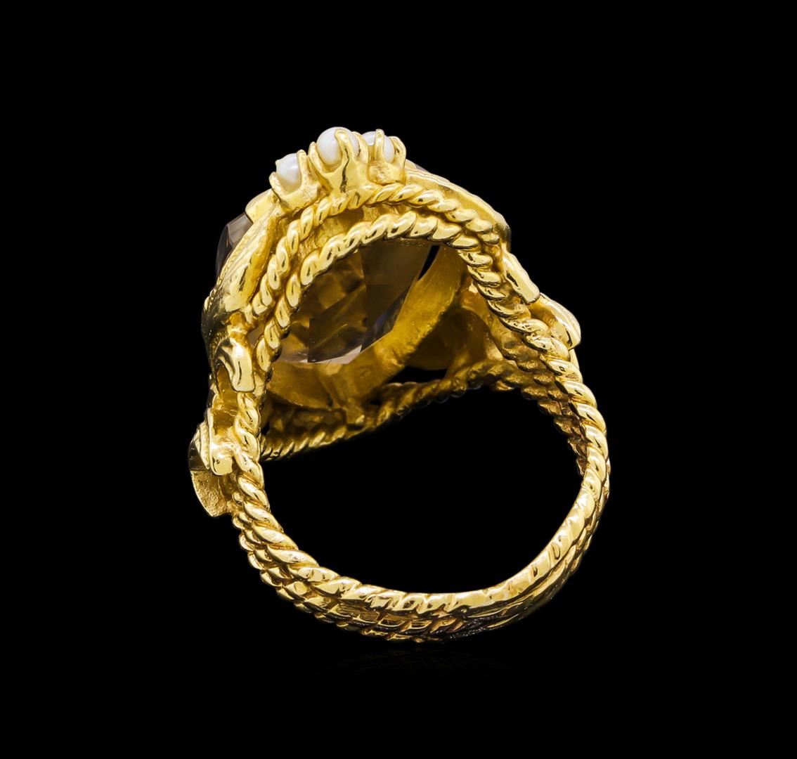 One electronically tested 14KT yellow gold ladies cast smoky quartz and seed pearl ring. The featured smoky quartz is set within an elaborate filigree frame with seed pearl accents supported by three-way split rope style shoulders, completed by a four millimeter wide band. Patterned finish. Condition is good. Containing: One prong set modified shield cut natural smoky quartz, measuring 20.00. x 13.10 x 7.10mm, approximate weight of 9.90ct., clarity is eye clean, medium, slightly grayish, brown color, (GIA Br 5/2), cut is good. Transmitting light with no distortion, transparent. Colored Stone Grading Report attached. Graded in the setting. Six seed pearls, 2.0mm in size to 2.0mm in size. The pearls are white in color with a very good luster, round to near round, mostly clean Graded in the setting. A seed pearl is a small natural pearl, formed in either a saltwater oyster or fresh water mussel, that is usually less the a one-quarter grain in weight and smaller then 2mm in size and off-round in shape. In jewelry they are used as decorative borders, tiny accents in small patterns or in larger clusters woven together to make up an entire piece of jewelry. One of the most historically famous examples of seed pearl jewelry is that of a seed pearl suite (a necklace and two matching bracelets) purchased on April 28, 1862 from Tiffany and Co. for Mary Todd Lincoln from President Abraham Lincoln to wear to the first Lincoln inaugural ball.. Total Weight of Colored Stones 9.90ct.. Total Weight of Ring 11.95gm. AIG Appraised at $2,225.00.