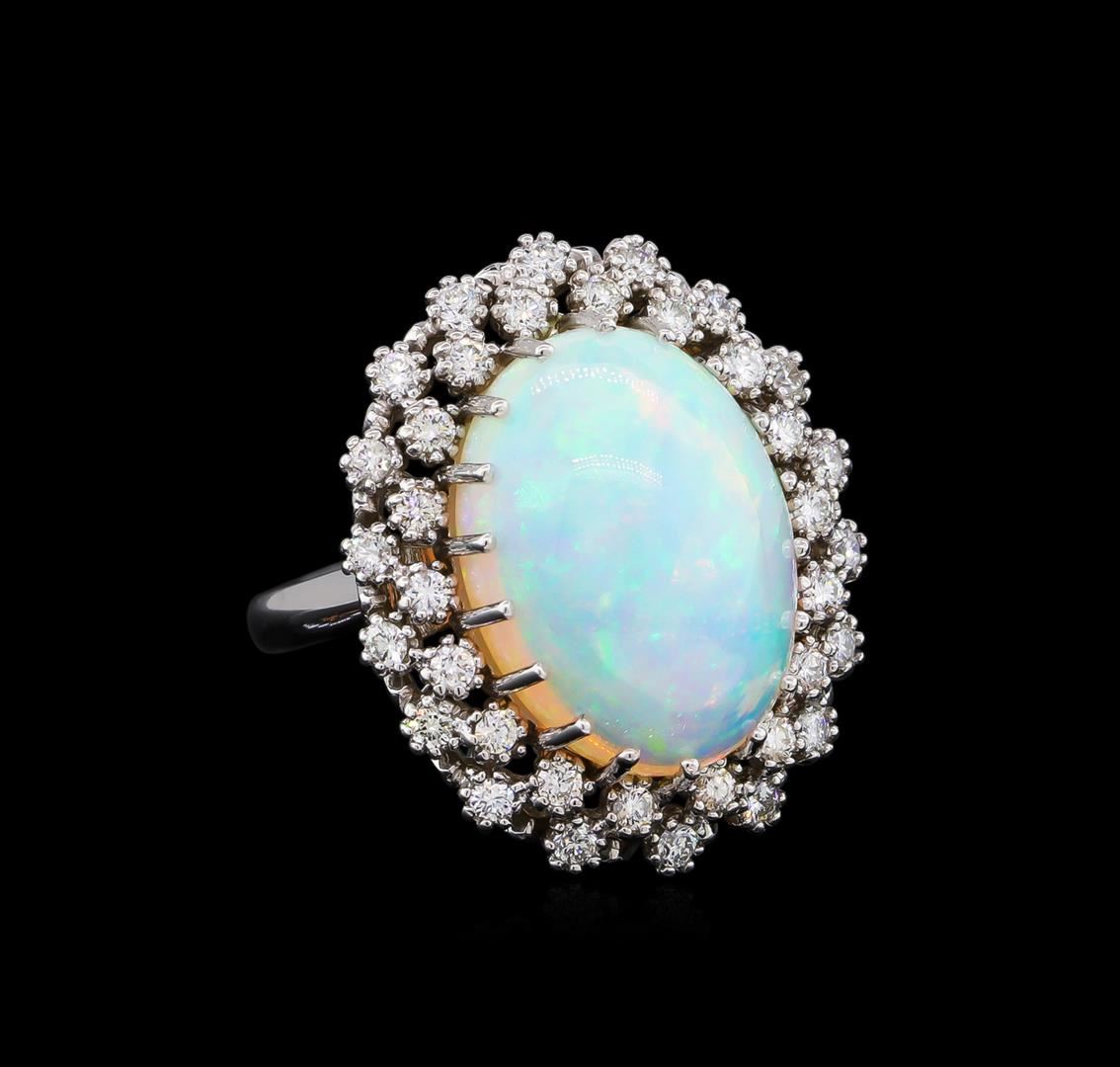 One electronically tested 14KT white gold ladies cast opal and diamond ring with a bright polish finish. The featured opal is set within tiered diamond bezels supported by ribbed under gallery, completed by a two millimeter wide band. Identified with markings of "K14". Condition is new, good workmanship. Containing: One crystal opal that is cut in a oval shaped cabochon and is prong set, measuring 18.00 mm long x 14.00 mm wide, and 8.50 mm thick and the approximate weight is 9.92 carats. The opal has a bright, green-blue play of color (fire) in a flashfire pattern; a medium dome; a good cut; no inclusions; consistent in its brightness and pattern; and is slightly directional. Graded in the setting. Thirty-Six prong set round brilliant cut diamonds approximate total weight of 36 Stones = 0.90ct. Graded in the setting. Clarity: VS-1 to SI-1. Color: D - F. Total Weight of Diamonds 0.90ct. Total Weight of Opals 9.92ct. Total Weight of Ring 10.50gm. AIG Appraised at $7,720.00.
