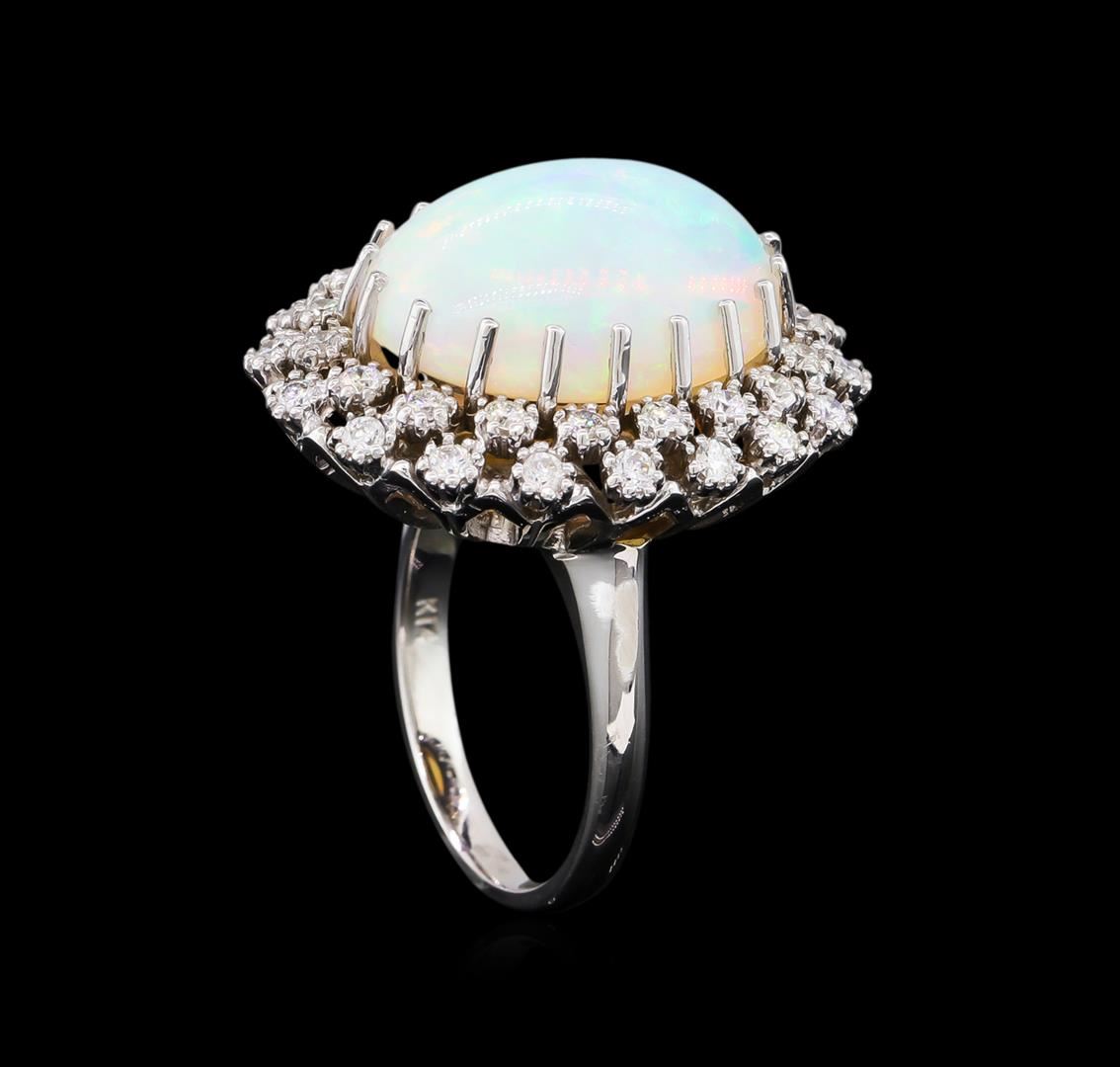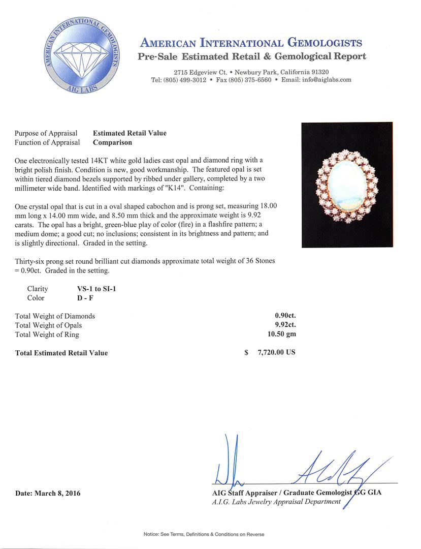 One electronically tested 14KT white gold ladies cast opal and diamond ring with a bright polish finish. The featured opal is set within tiered diamond bezels supported by ribbed under gallery, completed by a two millimeter wide band. Identified with markings of "K14". Condition is new, good workmanship. Containing: One crystal opal that is cut in a oval shaped cabochon and is prong set, measuring 18.00 mm long x 14.00 mm wide, and 8.50 mm thick and the approximate weight is 9.92 carats. The opal has a bright, green-blue play of color (fire) in a flashfire pattern; a medium dome; a good cut; no inclusions; consistent in its brightness and pattern; and is slightly directional. Graded in the setting. Thirty-Six prong set round brilliant cut diamonds approximate total weight of 36 Stones = 0.90ct. Graded in the setting. Clarity: VS-1 to SI-1. Color: D - F. Total Weight of Diamonds 0.90ct. Total Weight of Opals 9.92ct. Total Weight of Ring 10.50gm. AIG Appraised at $7,720.00.