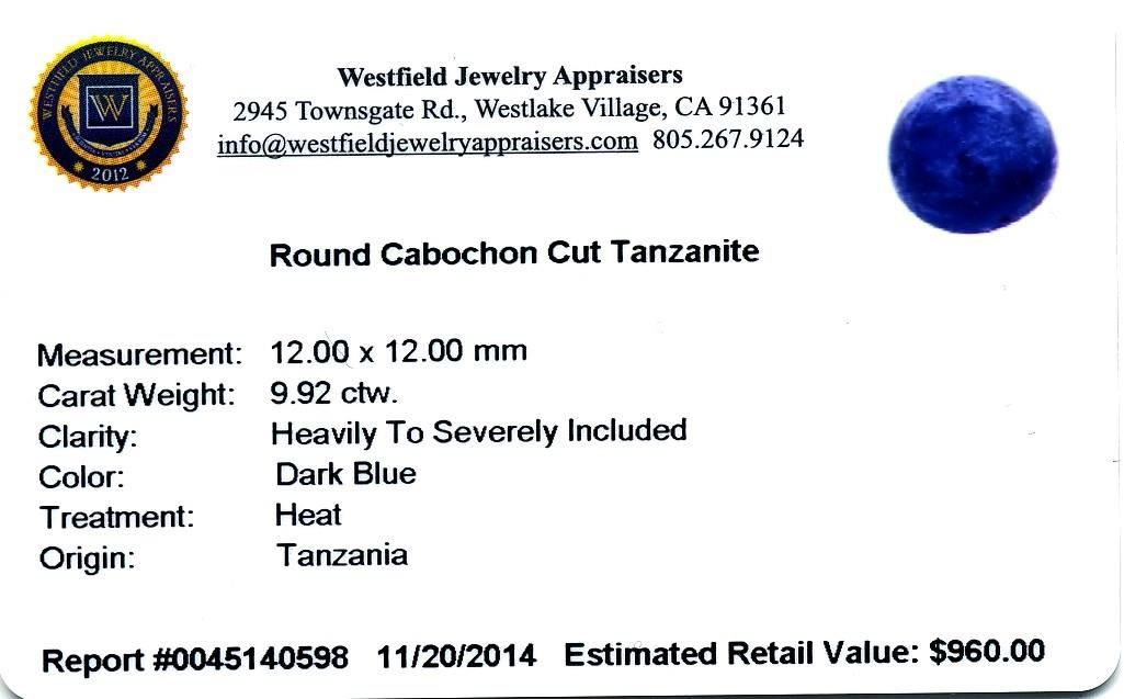 9.92ctw. Round Cabochon Cut Tanzanite. Westfield Appraised at $960.00.