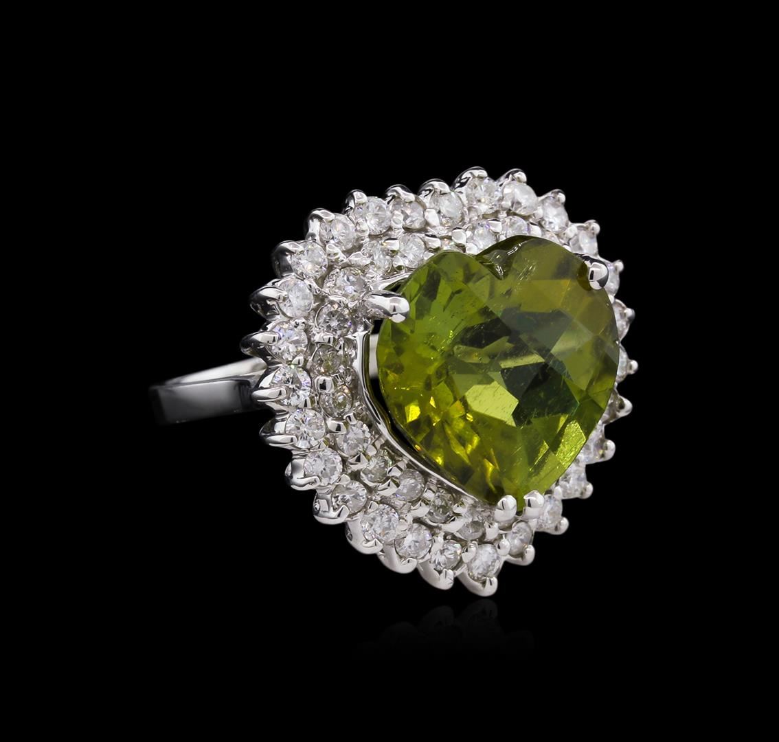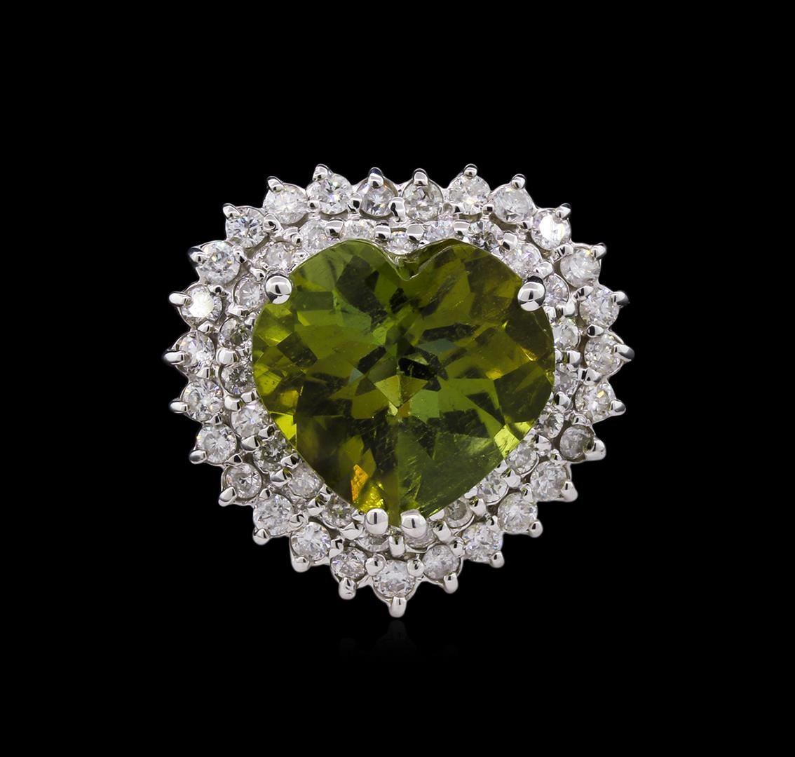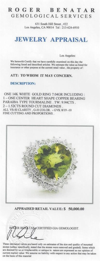 One 14KT White gold ring 7.04GR Including: One center heart shape copper bearing paraiba type tourmaline. TW: 9.94CTS. 1.52CTS round cut diamonds. All VS-SI Clarity, G-H Color Fine Cutting and Proportions. RBGS Appraised at $50,000.00.