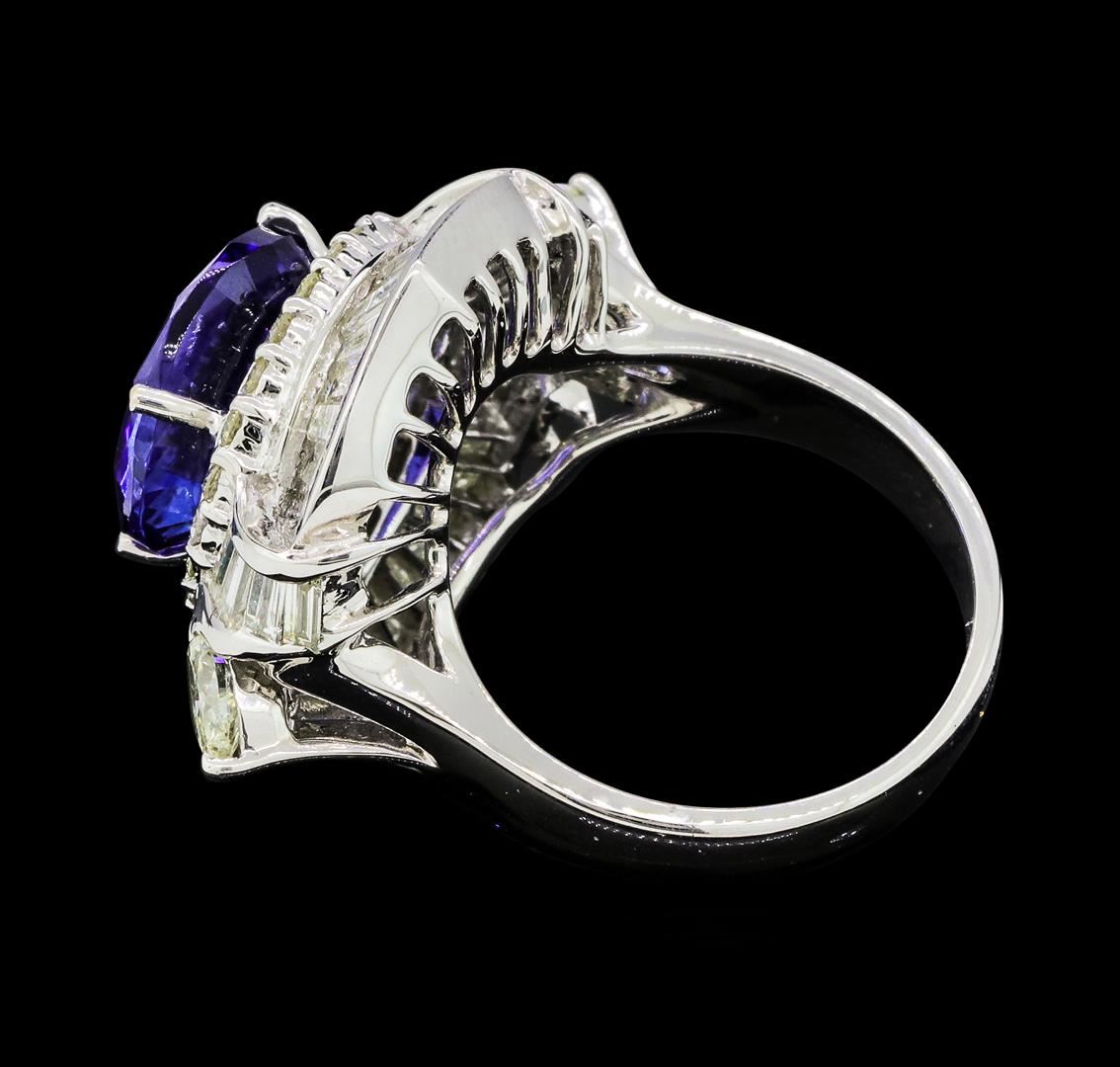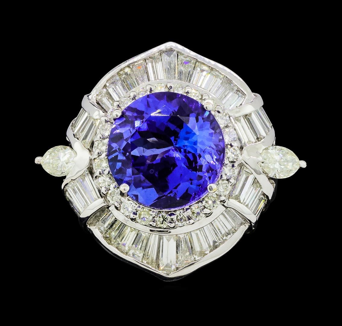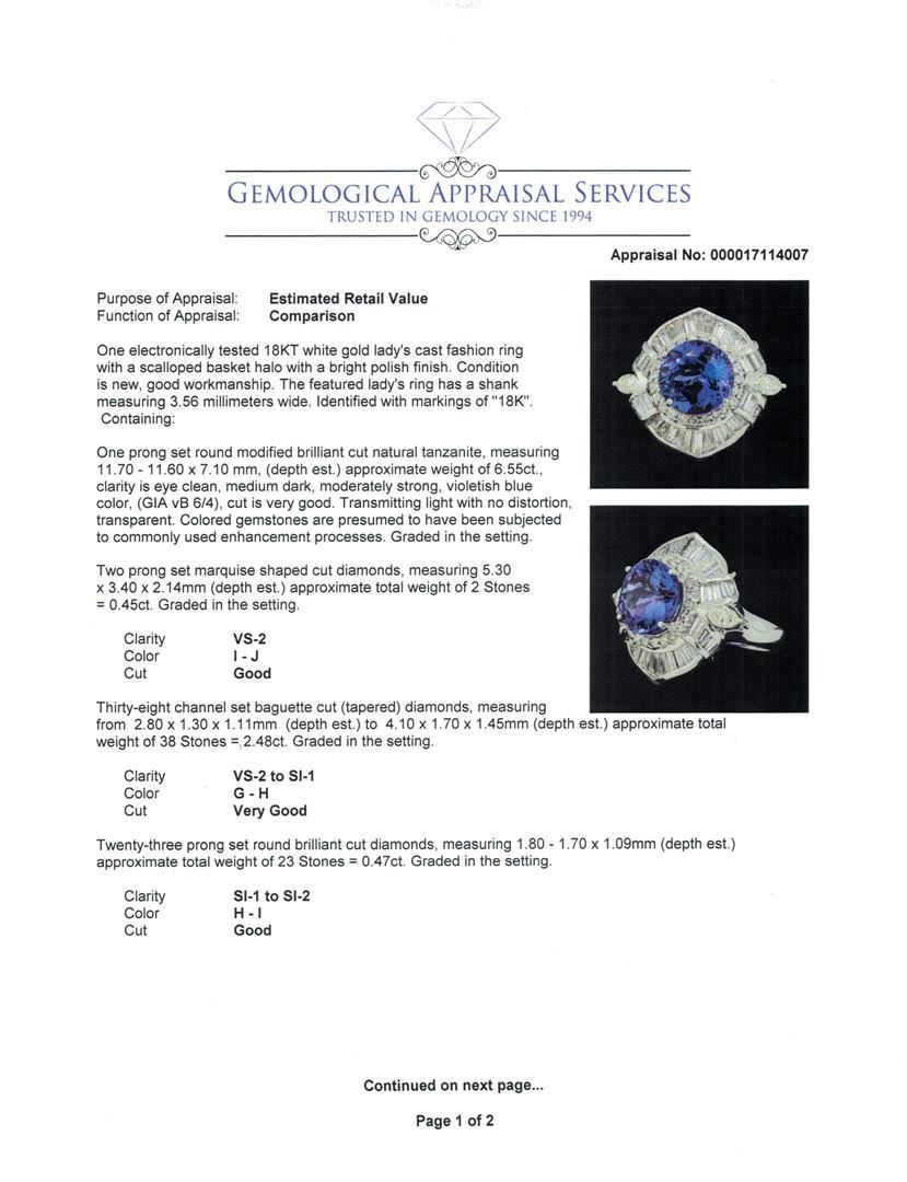 One electronically tested 18KT white gold lady's cast fashion ring with a scalloped basket halo with a bright polish finish. The featured lady's ring has a shank measuring 3.56 millimeters wide. Identified with markings of '18K'. Condition is new, good workmanship. Containing: One prong set round modified brilliant cut natural tanzanite, measuring 11.70 - 11.60 x 7.10 mm, (depth est.) approximate weight of 6.55ct., clarity is eye clean, medium dark, moderately strong, violetish blue color, (GIA vB 6/4), cut is very good. Transmitting light with no distortion, transparent. Colored gemstones are presumed to have been subjected to commonly used enhancement processes. Graded in the setting. Two prong set marquise shaped cut diamonds, measuring 5.30 x 3.40 x 2.14mm (depth est.) approximate total weight of 2 Stones = 0.45ct. Graded in the setting. Color I - J Clarity VS-2 Cut Good Thirty-Eight channel set baguette cut (tapered) diamonds, measuring from 2.80 x 1.30 x 1.11mm (depth est.) to 4.10 x 1.70 x 1.45mm (depth est.) approximate total weight of 38 Stones = 2.48ct. Graded in the setting. Color G - H Clarity VS-2 to SI-1 Cut Very Good Twenty-Three prong set round brilliant cut diamonds, measuring 1.80 - 1.70 x 1.09mm (depth est.) approximate total weight of 23 Stones = 0.47ct. Graded in the setting. Color H - I Clarity SI-1 to SI-2 Cut Good. Total Weight of Colored Stones 6.55ct.. Total Weight of Diamonds 3.40ct.. Total Weight of Ring 13.10gm GAS Appraised at $21020.00. GAS Appraised.
