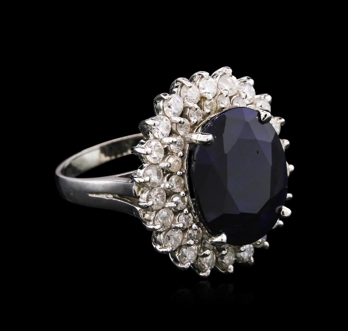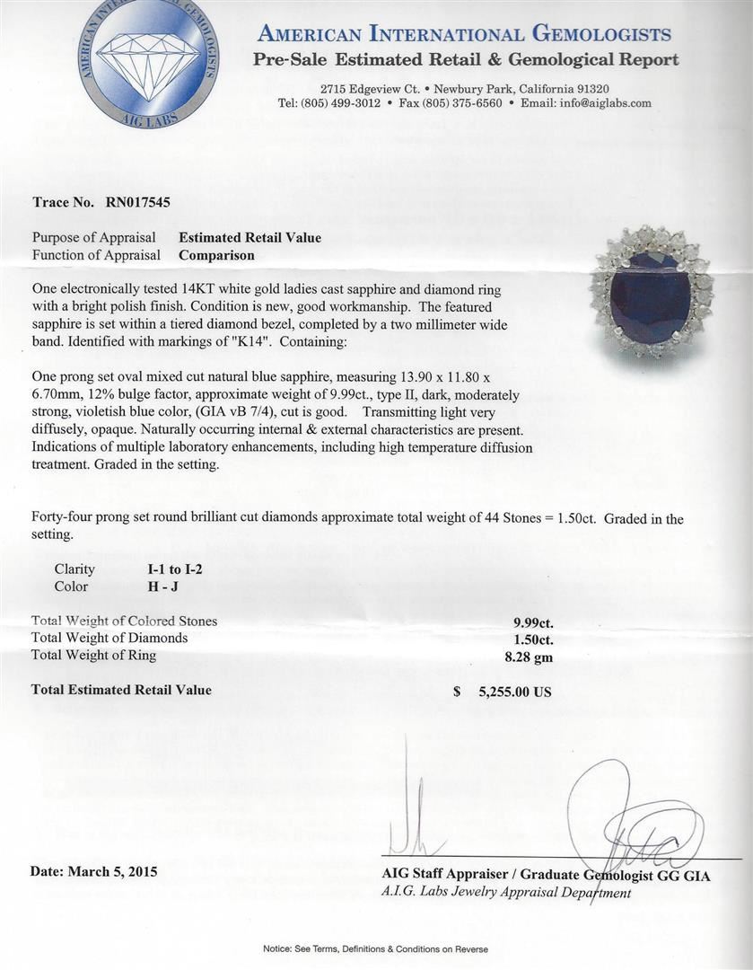 One electronically tested white gold ladies cast sapphire and diamond ring with a bright polish finish. Condition is new, good workmanship. The featured sapphire is set within a tiered diamond bezel, completed by a two millimeter wide band. Identified with markings of "K14". Containing: One prong set oval mixed cut natural blue sapphire, measuring 13.90 x 11.80 x 6.70mm, 12% bulge factor, approximate weight of 9.99ct., type II, dark, moderately strong, violetish blue color, (GIA vB 7/4), cut is good. Transmitting light very diffusely, opaque. Naturally occurring internal & external characteristics are present. Indications of multiple laboratory enhancements, including high temperature diffusion treatment. Graded in the setting. Forty-four prong set round brilliant cut diamonds approximate total weight of 44 Stones = 1.50ct. Graded in the setting. Clarity: I-1 to I-2.Color: H - J. AIG Appraised at $5,255.00.