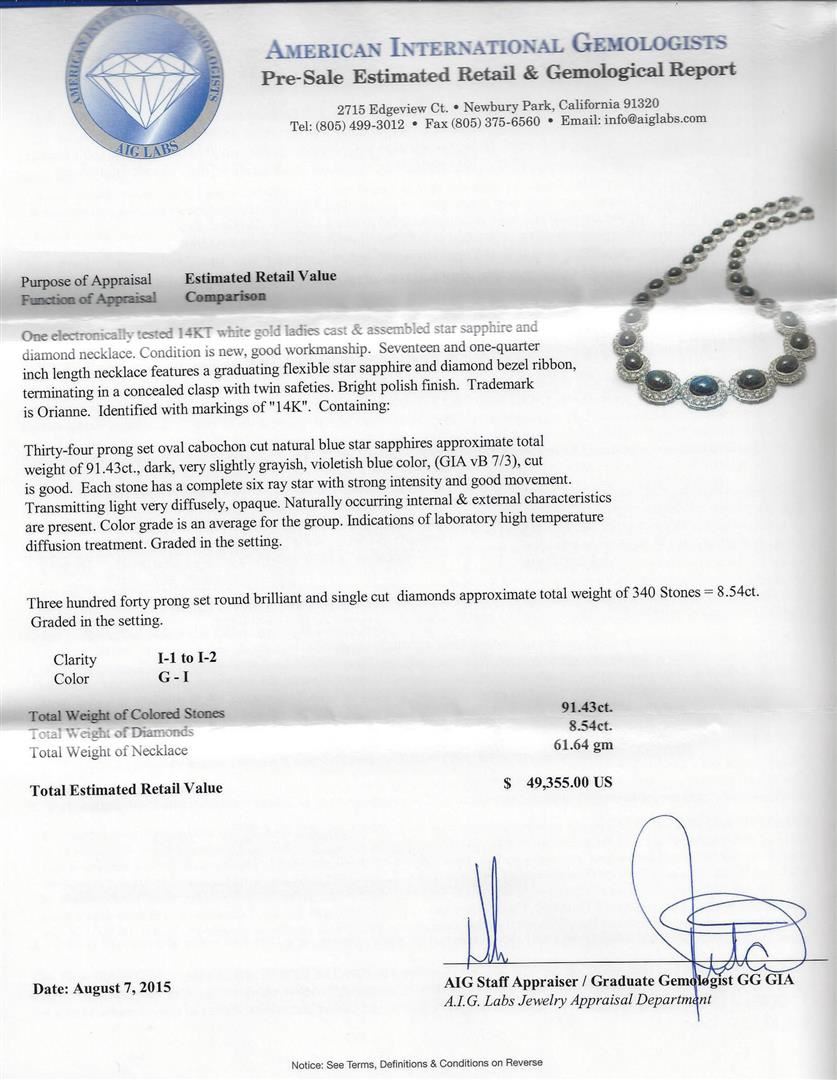 One electronically tested 14KT white gold ladies cast & assembled star sapphire and diamond necklace. Seventeen and one-quarter inch length necklace features a graduating flexible star sapphire and diamond bezel ribbon, terminating in a concealed clasp with twin safeties. Bright polish finish. Trademark is Orianne. Identified with markings of "14K". Condition is new, good workmanship. Containing: Thirty-four prong set oval cabochon cut natural blue star sapphires approximate total weight of 91.43ct., dark, very slightly grayish, violetish blue color, (GIA vB 7/3), cut is good. Each stone has a complete six ray star with strong intensity and good movement. Transmitting light very diffusely, opaque. Naturally occurring internal & external characteristics are present. Color grade is an average for the group. Indications of laboratory high temperature diffusion treatment. Graded in the setting. Three Hundred Forty prong set round brilliant and single cut diamonds approximate total weight of 340 Stones = 8.54ct. Graded in the setting. Clarity: I-1 to I-2. Color: G - I. Total Weight of Colored Stones 91.43ct. Total Weight of Diamonds 8.54ct. Total Weight of Necklace 61.64gm. AIG Appraised at $49,355.00.