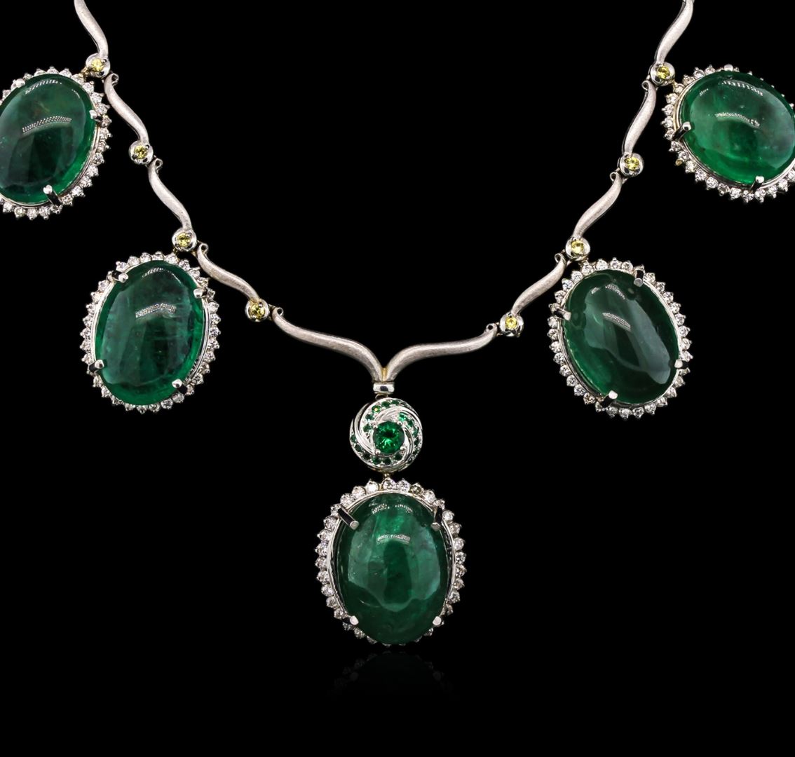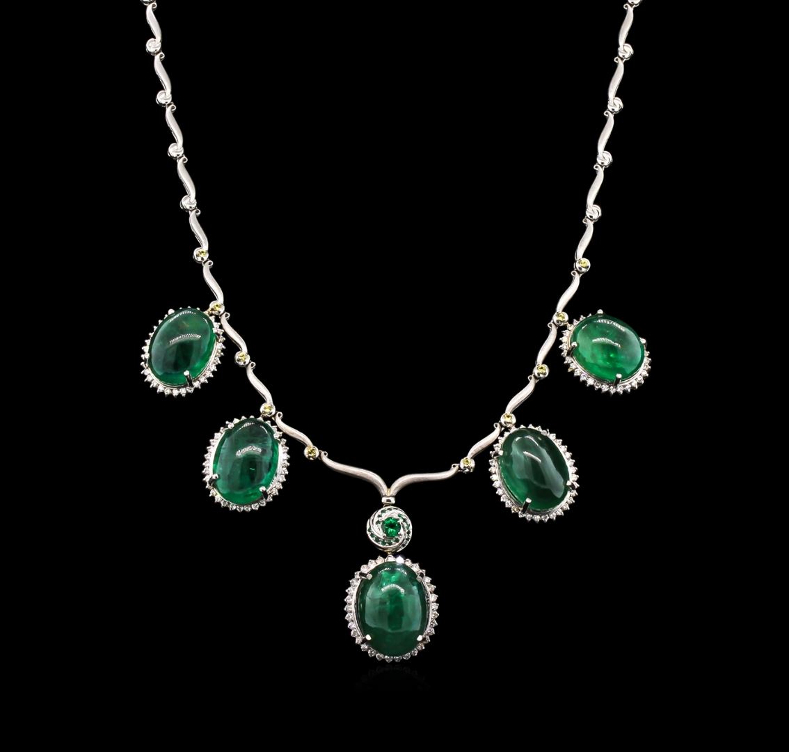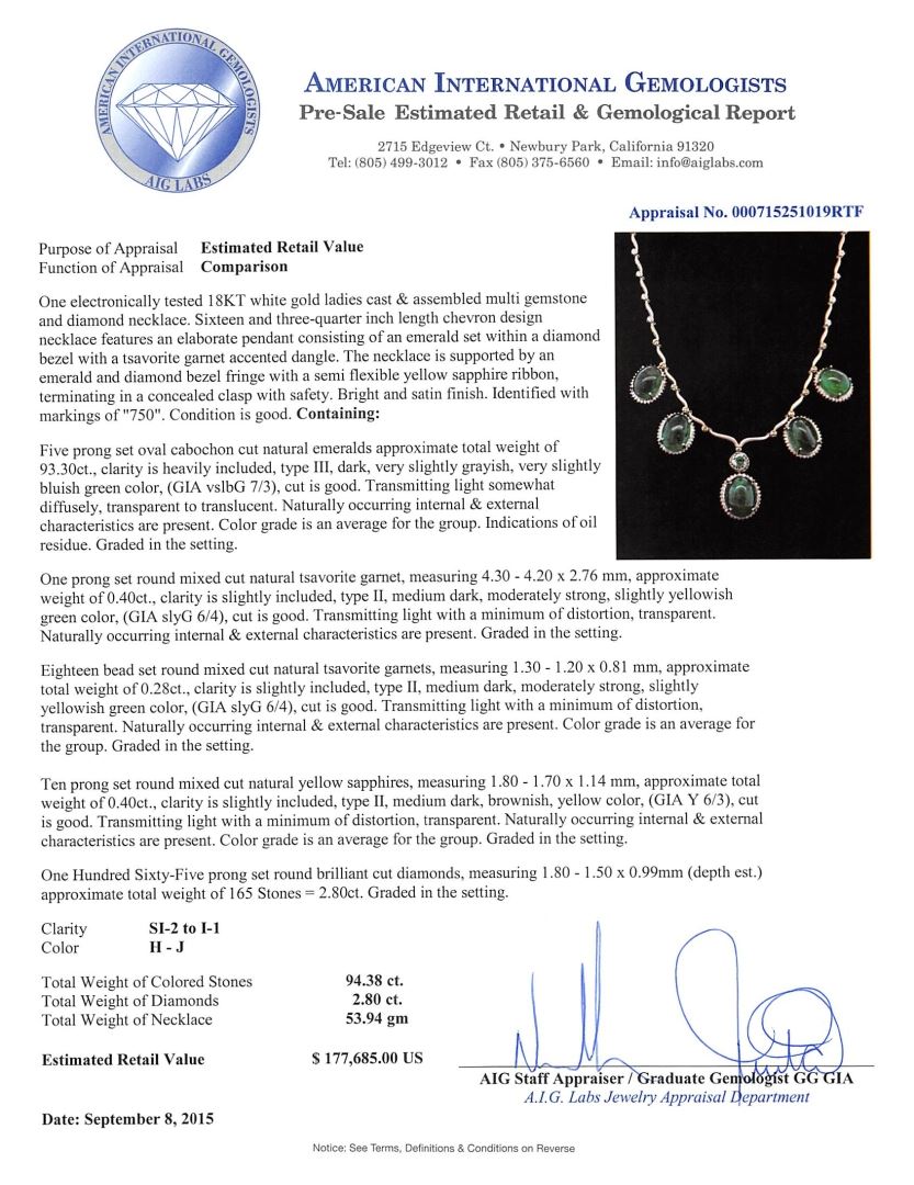 one and diamond necklace. Sixteen and three-quarter inch length chevron design necklace features an elaborate pendant consisting of an emerald set within a diamond bezel with a tsavorite accented dangle. The necklace is supported by an emerald and diamond bezel fringe with a semi flexible yellow sapphire ribbon, terminating in a concealed clasp with safety. Bright and satin finish. Identified with markings of "750". Condition is good. Containing: Five prong set oval cabochon cut natural emeralds approximate total weight of 93.30ct., clarity is heavily included, type III, dark, very slightly grayish, very slightly bluish green color, (GIA vslbG 7/3), cut is good. Transmitting light somewhat diffusely, transparent to translucent. Naturally occurring internal & external characteristics are present. Color grade is an average for the group. Indications of oil residue. Graded in the setting. One prong set round mixed cut natural tsavorite garnet, measuring 4.30 - 4.20 x 2.76 mm, approximate weight of 0.40ct., clarity is slightly included, type II, medium dark, moderately strong, slightly yellowish green color, (GIA slyG 6/4), cut is good. Transmitting light with a minimum of distortion, transparent. Naturally occurring internal & external characteristics are present. Graded in the setting. Eighteen bead set round mixed cut natural tsavorite garnets, measuring 1.30 - 1.20 x 0.81 mm, approximate total weight of 0.28ct., clarity is slightly included, type II, medium dark, moderately strong, slightly yellowish green color, (GIA slyG 6/4), cut is good. Transmitting light with a minimum of distortion, transparent. Naturally occurring internal & external characteristics are present. Color grade is an average for the group. Graded in the setting. Ten prong set round mixed cut natural yellow sapphires, measuring 1.80 - 1.70 x 1.14 mm, approximate total weight of 0.40ct., clarity is slightly included, type II, medium dark, brownish, yellow color, (GIA Y 6/3), cut is good. Transmitting light with a minimum of distortion, transparent. Naturally occurring internal & external characteristics are present. Color grade is an average for the group. Graded in the setting. One Hundred Sixty-Five prong set round brilliant cut diamonds, measuring 1.80 - 1.50 x 0.99mm (depth est.) approximate total weight of 165 Stones = 2.80ct. Graded in the setting. Clarity: SI-2 to I-1. Color: H - J. Total Weight of Colored Stones 94.38ct. Total Weight of Diamonds 2.80ct. Total Weight of Necklace 53.94gm. AIG Appraised at $177,685.00.