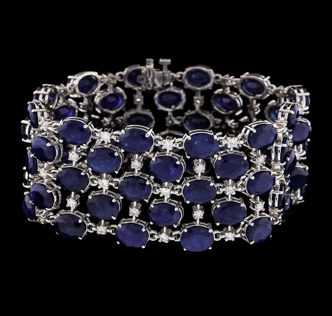 One electronically tested 14KT white gold lady's combination cast & assembled fashion bracelet with a double tongue clasp with foldover safeties with a bright polish finish. The featured lady's bracelet has five connected rows of alternating sapphires and diamonds and measures approximately 7 inches in length. Condition is new, good workmanship. Containing: Sixty prong set oval modified mixed cut natural blue sapphires, measuring 7.95 x 6.10 x 3.80mm, (depth est.) approximate total weight of 93.96ct., clarity is severely included, medium dark, very slightly grayish, blue color, (GIA B 6/3), cut is good. Transmitting light somewhat diffusely, semi-transparent to translucent. Naturally occurring internal & external characteristics are present. Indications of laboratory high temperature heat treatment. Colored gemstones are presumed to have been subjected to commonly used enhancement processes. Graded in the setting. Sixty prong set round brilliant cut diamonds, measuring 2.40 - 2.30 x 1.41mm (depth est.) approximate total weight of 60 Stones = 2.87ct. Graded in the setting. Clarity SI-1 to I-1. Color: H - I Cut Good. Total Weight of Colored Stones 93.96ct.. Total Weight of Diamonds 2.87ct.. Total Weight of Bracelet 63.00gm. GAS Appraised at $19,855.00.