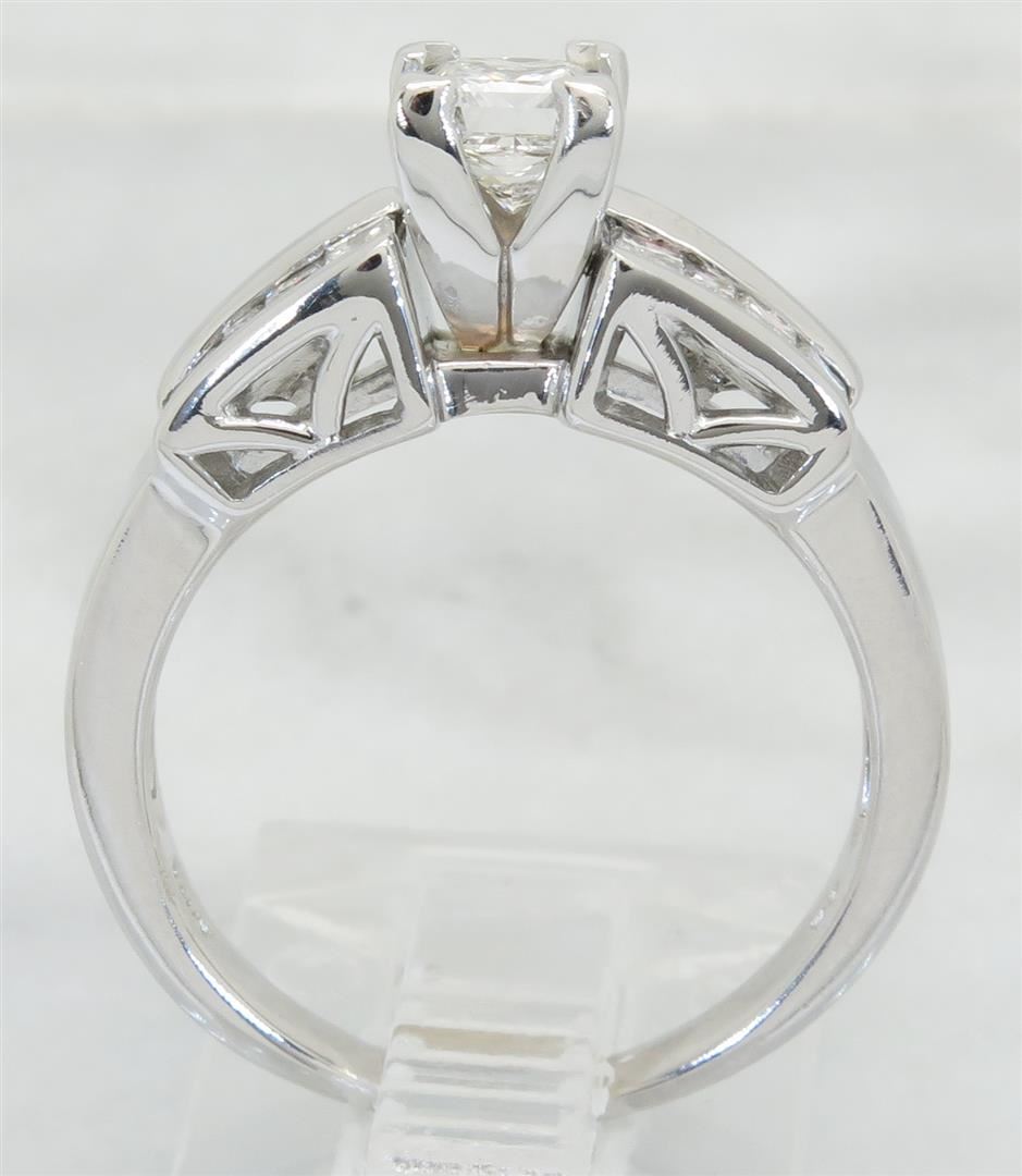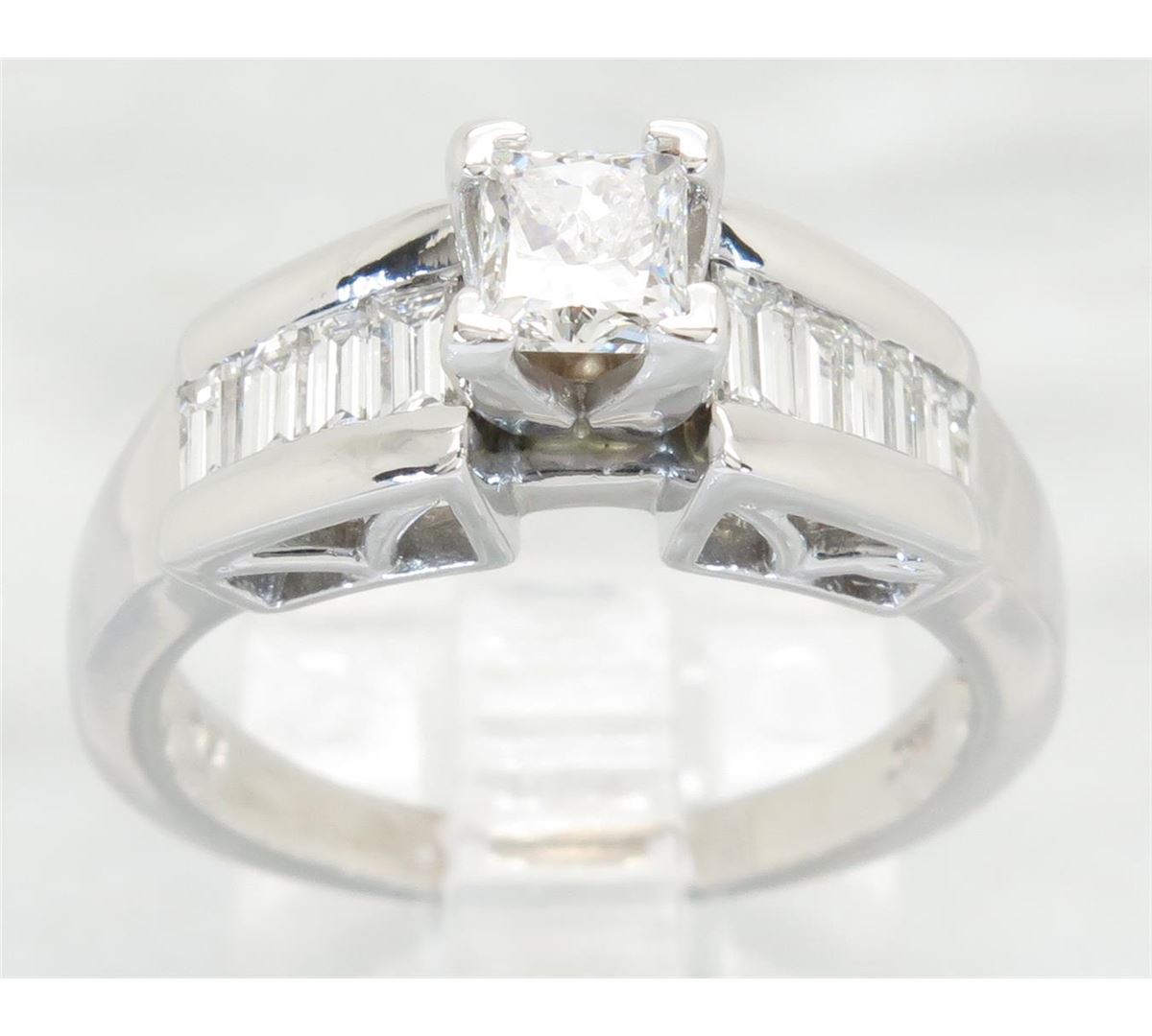 One tested 14K white gold diamond ring. Containing: One Princess Cut Diamond. Approximate Size: .45CT, Clarity: VS, Color: F-G. 8 Baguette Cut Diamonds. Approximate total diamond weight: .95CTW. All diamonds are graded in the mounting unless otherwise stated. Weight of ring: 5.1 grams, Size: 5.75.