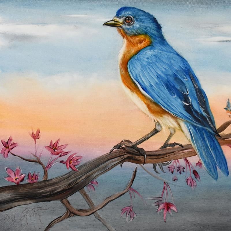 "A Bluebird in Your Yard" is an original oil painting on stretched canvas by Martin Katon, hand signed by the artist. Includes Letter of Authenticity. Measures approx. 20" x 20" (image).