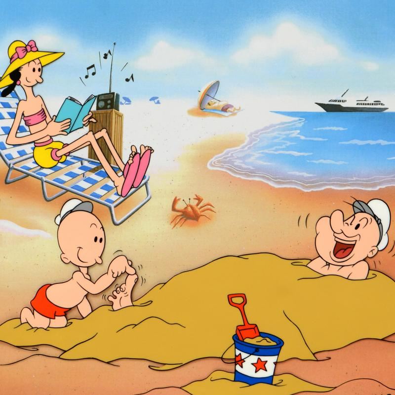 "A Day At The Beach" is a limited edition hand inked and hand painted animation cel with background, numbered and hand signed by Myron Waldman (1908-2006). Includes Certificate of Authenticity! Measures approx. 14" x 12" (background), 11" x 9" (cel).
