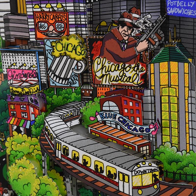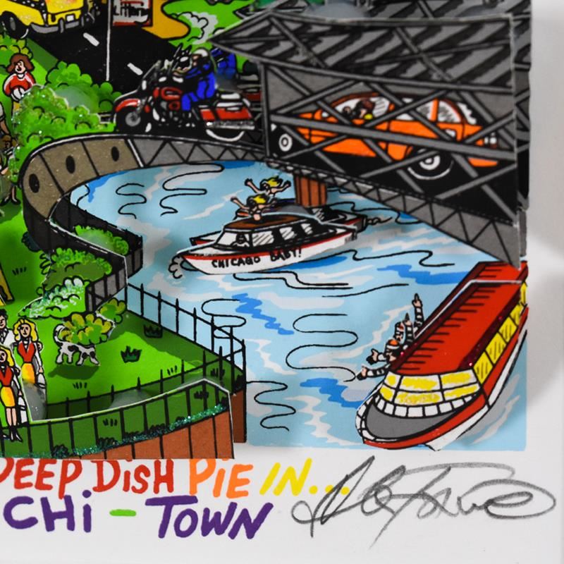 "A Deep Dish Pie in Chi Town (Black)" is a 3D limited edition silk screen construct on paper by Charles Fazzino, numbered and hand signed by the artist. This piece comes custom framed. Includes Certificate of Authenticity. Measures approximately 13" x 37" (frame), 6" x 29" (image).
