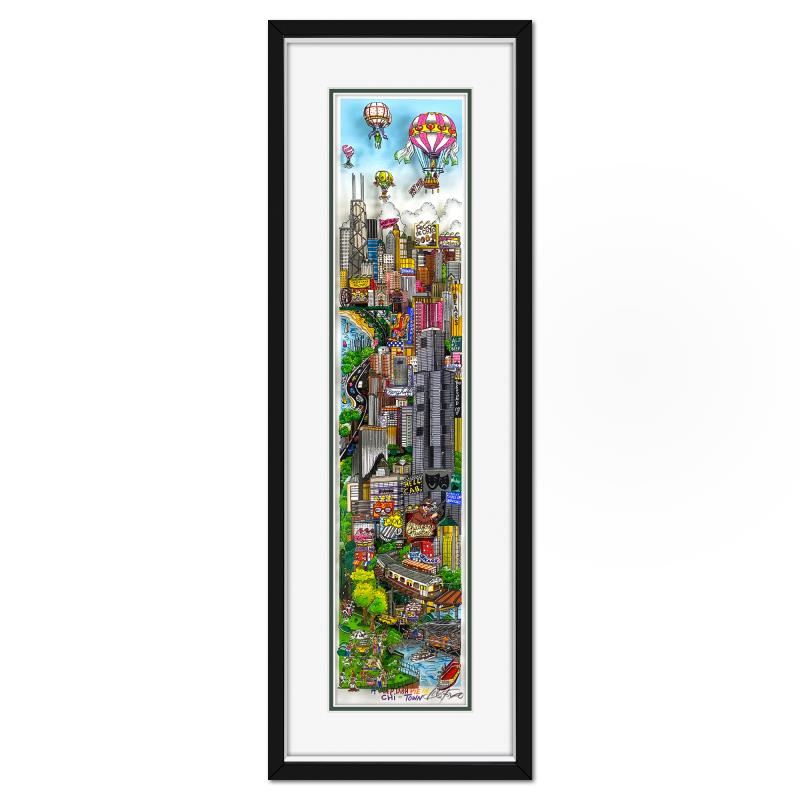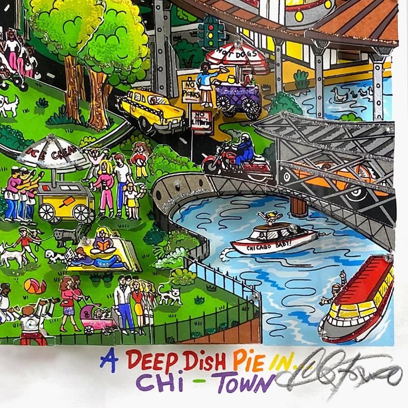 "A Deep Dish Pie in Chi Town" is a 3D limited edition silk screen construct on paper by Charles Fazzino DX numbered and hand signed by the artist. This piece comes custom framed. Includes Certificate of Authenticity. Measures approximately 37" x 13" (framed) 29" x 6" (image).