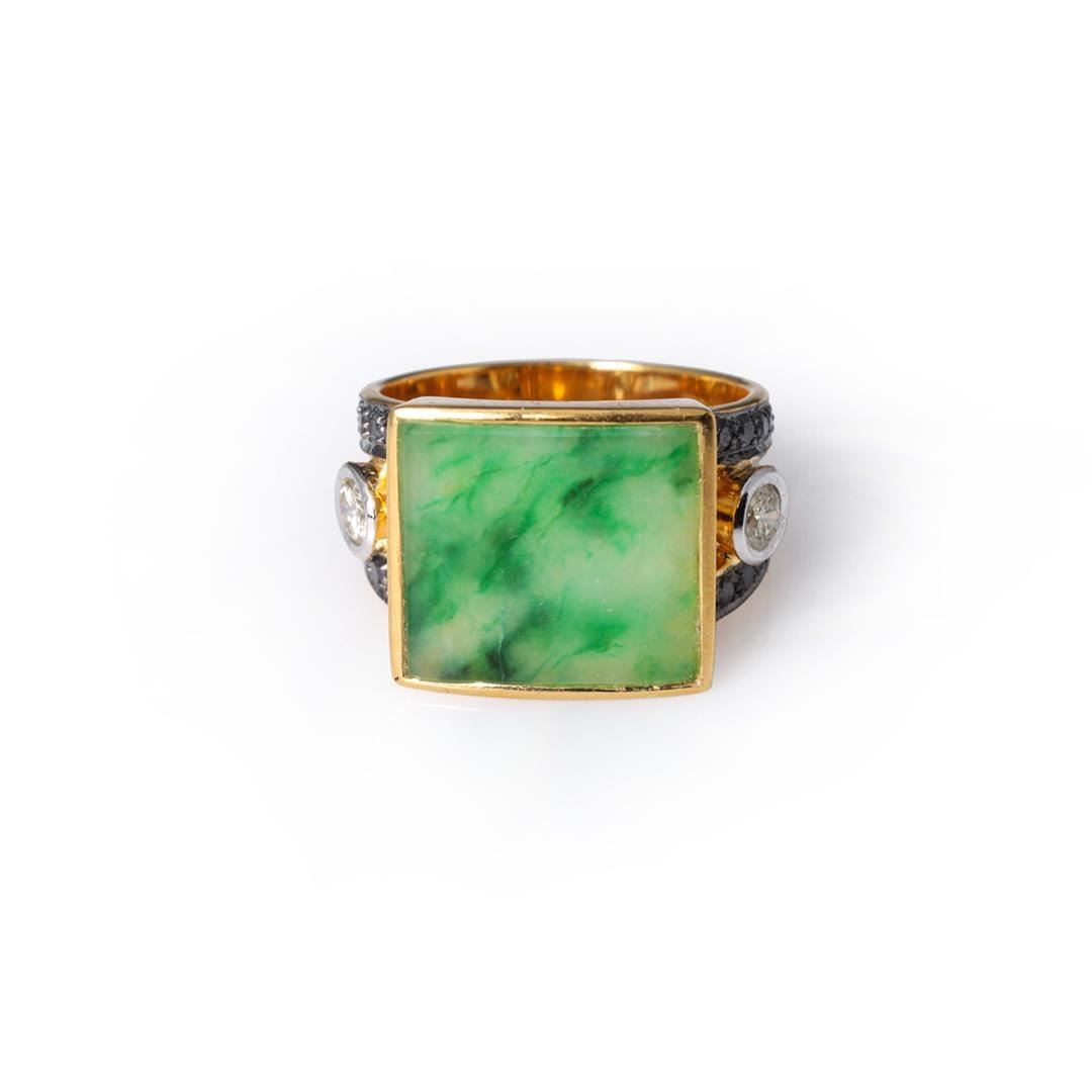 18k Yellow Gold Fine Multicolored Jadeite & Diamond Ring by Carlo Rici containing 14mm x 13mm jadeite with two round brilliant cut diamonds weighing 0.30 cts and twenty round brilliant black diamonds weighing approximately 0.40 cts. Total weight of ring i