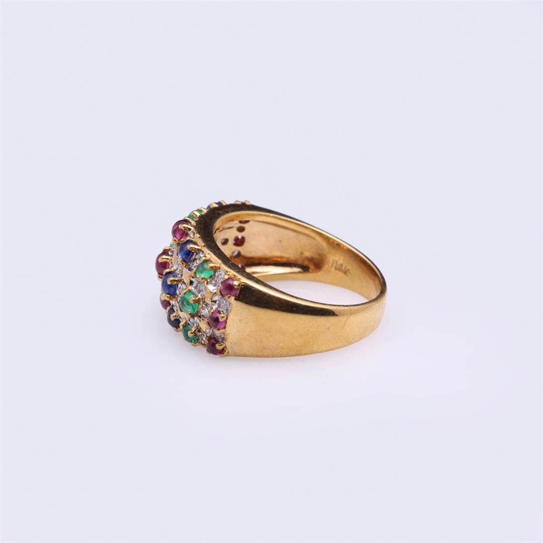A Highly Unusual Five Row Diamond & Gem Set 18k Yellow Gold Ring containing colored gemstones weighing approximately 1.24 cts and thirty two brilliant cut round diamonds weighing approximately 0.23 cts. Total weight is 7.2 gm. Estimated retail value $3,50