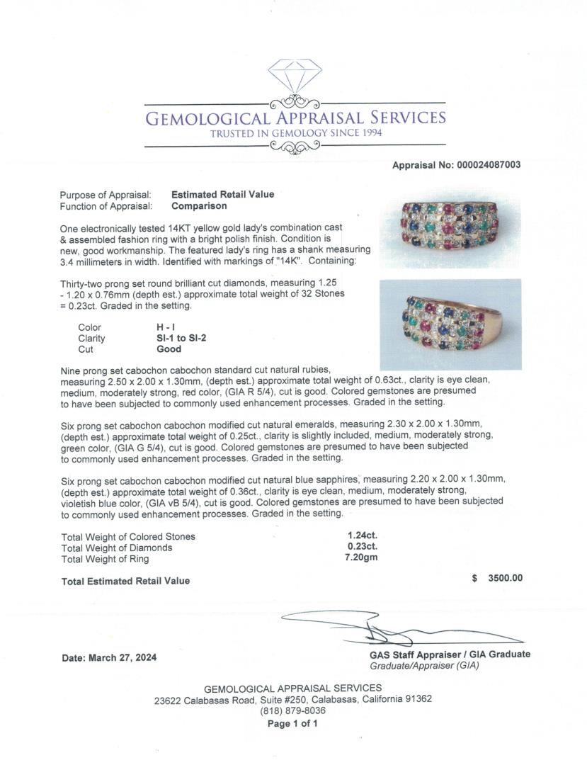 A Highly Unusual Five Row Diamond & Gem Set 18k Yellow Gold Ring containing colored gemstones weighing approximately 1.24 cts and thirty two brilliant cut round diamonds weighing approximately 0.23 cts. Total weight is 7.2 gm. Estimated retail value $3,50