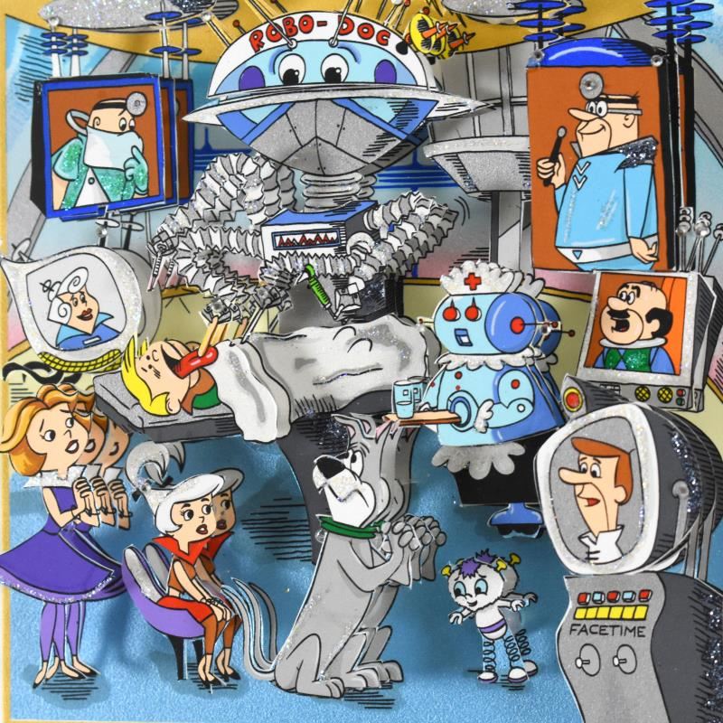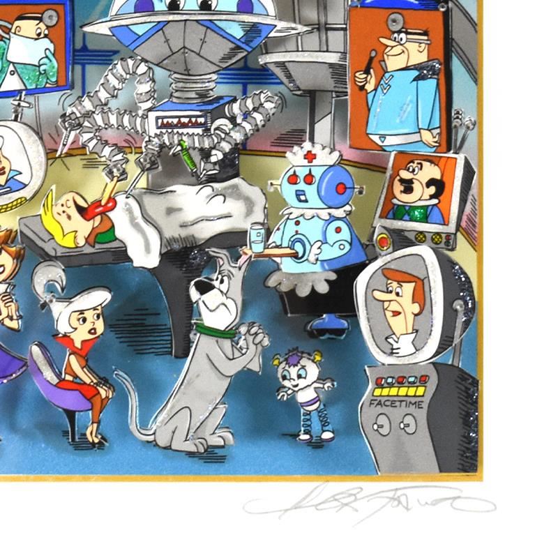 "A Jetson's House Call" is a 3D limited edition silk screen construct on paper by Charles Fazzino, DX numbered 93/100 and hand signed by the artist. This piece comes custom framed. Includes Certificate of Authenticity. Measures approximately 14" x 14" (framed), 6" x 6" (image).
