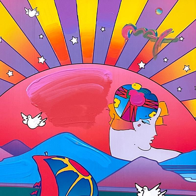 "A New Beginning" is a one-of-a-kind acrylic mixed media on paper, hand signed by Peter Max. The piece comes custom framed with a backside cutout to display Peter Max Studio registration number 293925 certifying authenticity. Measures approx. 36" x 30" (frame), 24" x 18" (image).
