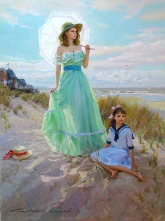 Russian artist, Constantin Lvovich, transports his viewers back in time to view a delicate young woman in a flowing, sea green dress and a young girl enjoying a day at the seashore. The oil on canvas measures 29.5 x 21.625; framed image measures approx. 41.5 x 33.625.
