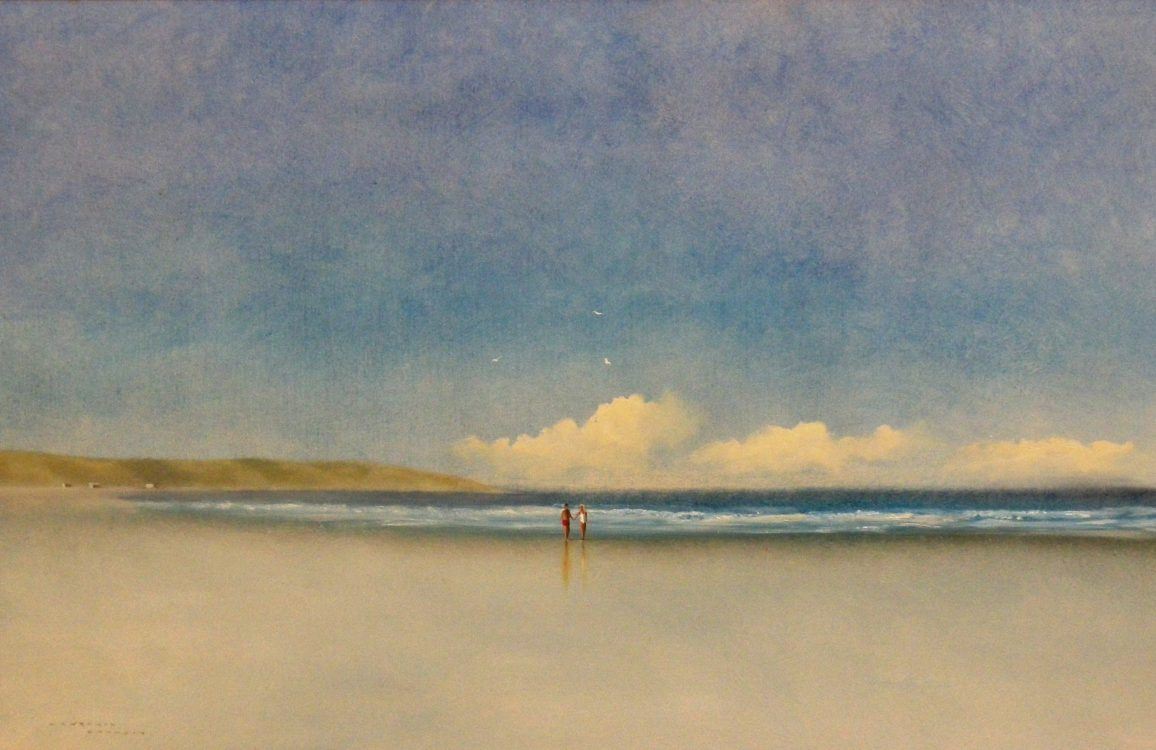 A Perfect Day by Lawrence Coulson is a framed oil on canvas with a couple walking in the distance on a beach. The size is 30 1/2" 40 1/2".