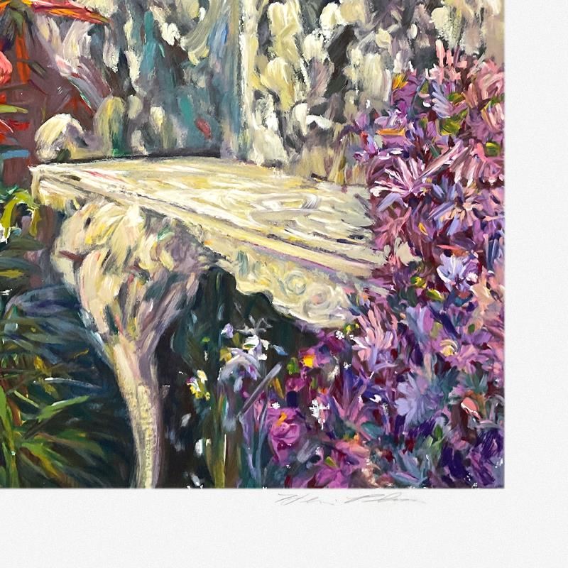 "A Place in the Garden" is a limited edition serigraph on paper by Henri Plisson (1933-2006), numbered 1/20 and hand signed by the artist. Includes Letter of Authenticity. Measures approx. 39" x 30" (border), 33.5" x 25" (image).