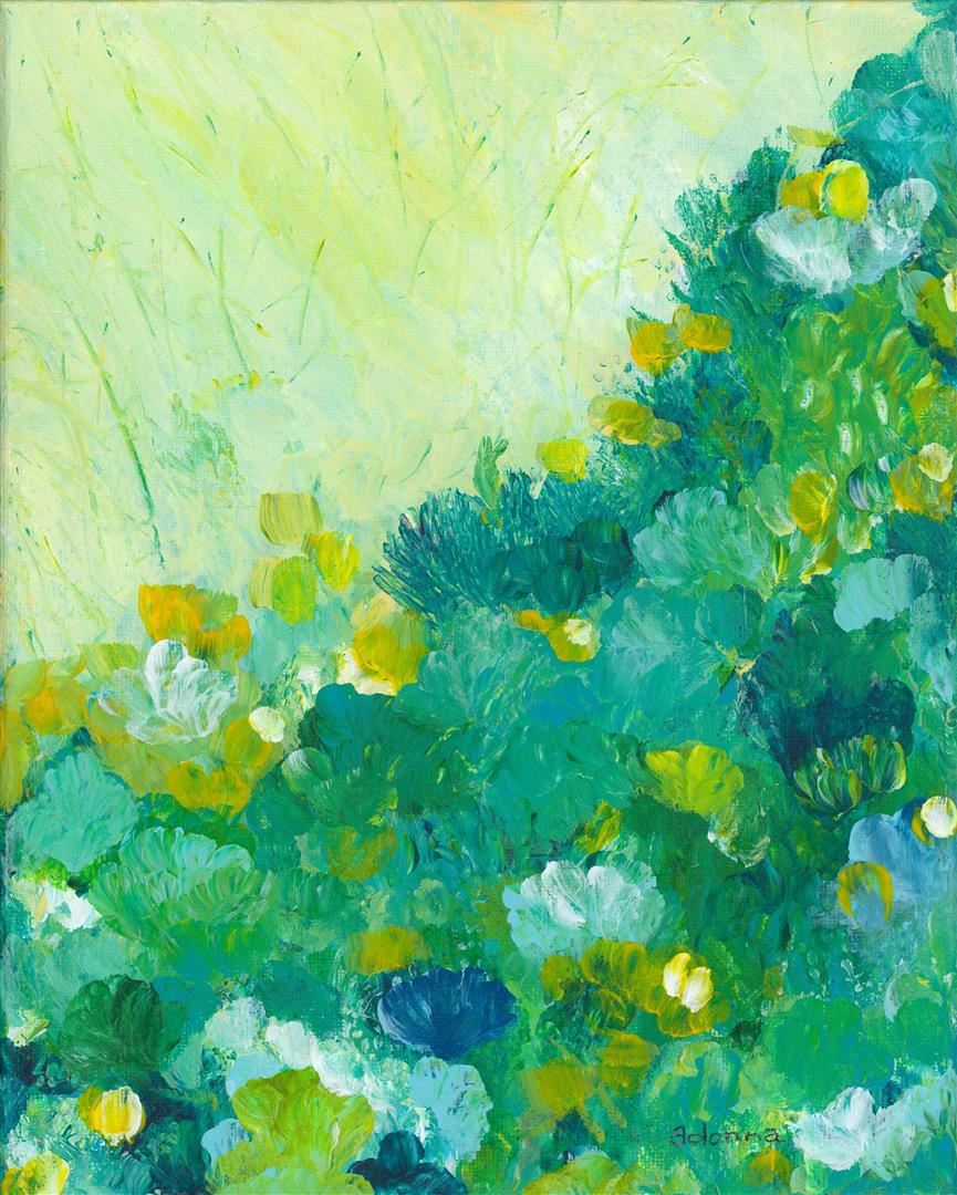 An original Acrylic on stretched canvas by Adonna. 8 x 10. A field of green and blue greet you with a touch of gold