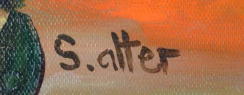 Artist: Shlomo Alter - Title: From the Window - Medium: Original Acrylic on Canvas - Signature: This one-of-a-kind work is hand-signed by the artist at the bottom of the image - Image Size: Approximately 27.5 inches x 23.5 inches - Unframed on Unstretched Canvas - Details: This work comes with a Certificate of Authenticity - Biography: Shlomo Alter was born in Romania to a family of restaurateurs. He immigrated to Israel in 1948 and during high school he started to study painting under the well known artist Aaron Avni. Some of his early works appeared in UNICEF'S world touring exhibition of young artists. Altar's works are influenced by his early recollections of the well dressed people who gathered in the courtyard of his parent's restaurant in Bucharest to eat and drink, to dance of Gypsy bands, and to enjoy the convivial atmosphere. With a touch of optimism and good humor Alter's art reflects life at its core, an antithesis to the Nazi regime that shattered his childhood happiness. - His paintings are like stage set on which the objects relate to each other through a glow of colors and lines - a frozen moment in time, a dynamic stillness prior to a burst of action. His style can best be compared to that of the Expressionists. He uses color to give direct expression to his ideas in influence by the famous, particularly Matisse and Duty. -
