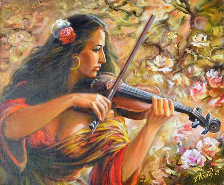 ARKADY **LONE VIOLINIST ** SIGNED ORIGINAL ACRYLIC. Artist: Arkady Ostritski (b. 1948) - Title: Lone Violinist - Medium: Acrylic on Canvas - Signature: This one-of-a-kind work is hand-signed by the artist at the bottom of the image - Image Size: Approximately 19 ½ inches x 23 ¾ inches - Framed: Unframed on Unstretched Canvas - Details: This work comes with a Certificate of Authenticity - Biography: Arkady Ostritsiki was born in 1948 in Kishinev, Molodova, once part of The USSR. He was recognized very early as gifted in drawing and painting and by the age of 20 was accepted in Moldova's most distinguished Art Academy - the Rapin Art Academy. - He graduated with distinction, earned many awards, and became one of his country's most important painters. He was chosen to paint numerous monumental works in public institutions, and created many large frescos. He has had numerous one-person and group exhibitions in galleries and museums throughout the USSR and Europe, in addition to several exhibitions in the U.S. and most recently in Japan. - Warranty: Item GUARANTEED to be as described